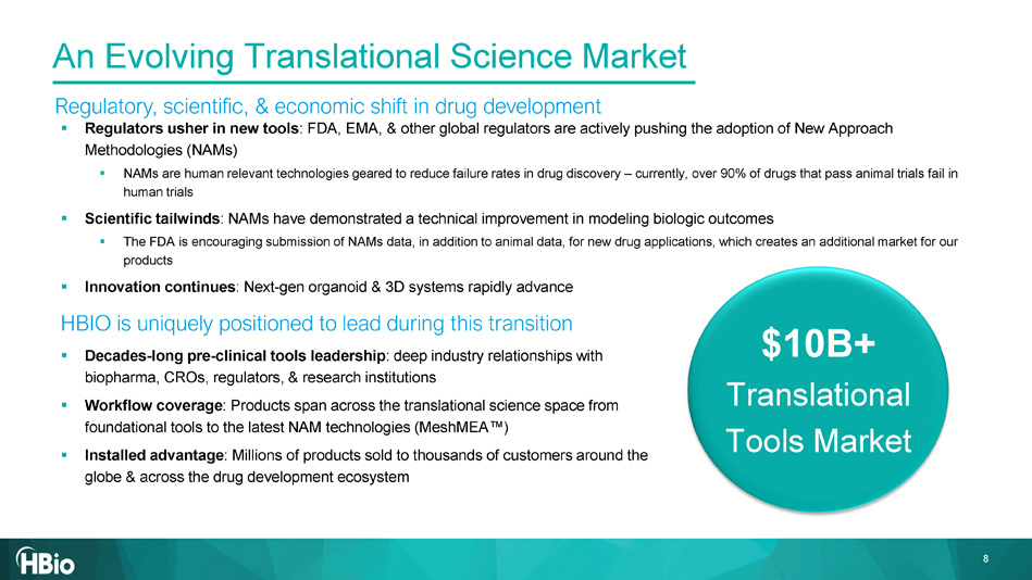 Key Strategic Pillars: The New Harvard Bioscience Historically known as life sciences tools company, becoming pure play Translational Science Tools company Positioning Company For Long - Term Growth Integrate in vivo telemetry with in vitro organoid platforms Scale High - Margin Innovation Advance differentiated NPI in telemetry, electrophysiology, & organoids Expand Recurring Revenue Mix Grow consumables, software, & services attached to installed base Operate with Discipline Use preclinical cash flows to fund R&D, margin expansion, & bolt - ons Lead the Translational Bridge 7