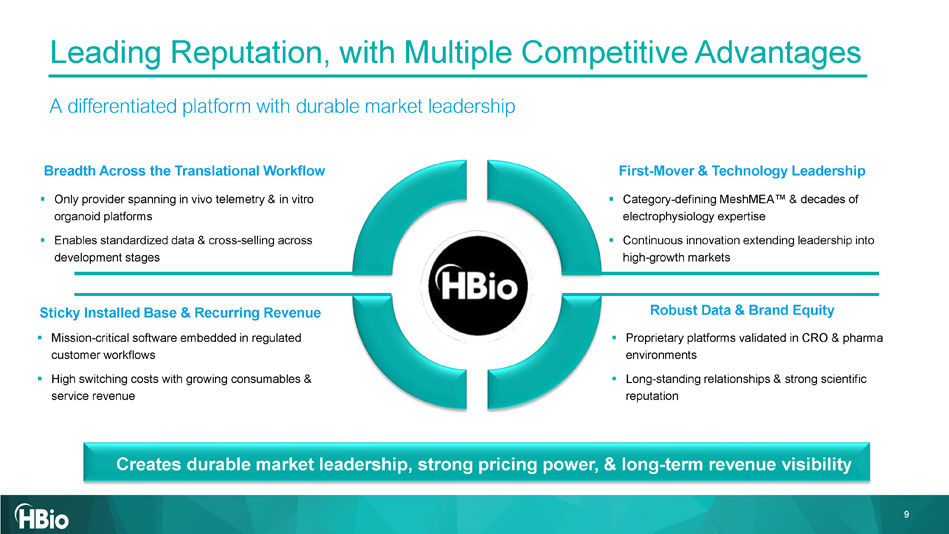 An Evolving Translational Science Market 8 ▪ Regulators usher in new tools : FDA, EMA, & other global regulators are actively pushing the adoption of New Approach Methodologies (NAMs) ▪ NAMs are human relevant technologies geared to reduce failure rates in drug discovery – currently, over 90% of drugs that pass a nimal trials fail in human trials ▪ Scientific tailwinds : NAMs have demonstrated a technical improvement in modeling biologic outcomes ▪ The FDA is encouraging submission of NAMs data, in addition to animal data, for new drug applications, which creates an addit ion al market for our products ▪ Innovation continues : Next - gen organoid & 3D systems rapidly advance HBIO is uniquely positioned to lead during this transition ▪ Decades - long pre - clinical tools leadership : deep industry relationships with biopharma, CROs, regulators, & research institutions ▪ Workflow coverage : Products span across the translational science space from foundational tools to the latest NAM technologies ( MeshMEA ) ▪ Installed advantage : Millions of products sold to thousands of customers around the globe & across the drug development ecosystem Regulatory, scientific, & economic shift in drug development $10B+ Translational Tools Market