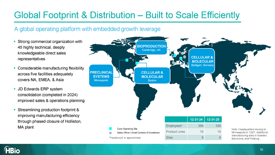 CELLULAR & MOLECULA R Boston PRECLINICAL SYSTEMS Minneapolis Core Operating Site Sales Office / Small Centers of Excellence *Headcount is approximate. Note: Headquarters moving to Minneapolis in 1Q27; Additional manufacturing sites in Sweden, Barcelona, and Freiburg 12 - 3 1 - 25 12 - 31 - 24 3 39 354 Employees* 10 10 Product Lines 8 8 Sites BIOPRODUCTION Cambridge, UK CELLULAR & 10 MOLECULAR Stuttgart, Germany ▪ Strong commercial organization with 45 highly technical, deeply knowledgeable direct sales representatives ▪ Considerable manufacturing flexibility across five facilities adequately covers NA, EMEA, & Asia ▪ JD Edwards ERP system consolidation (completed in 2024) improved sales & operations planning ▪ Streamlining production footprint & improving manufacturing efficiency through phased closure of Holliston, MA plant A global operating platform with embedded growth leverage Global Footprint & Distribution – Built to Scale Efficiently