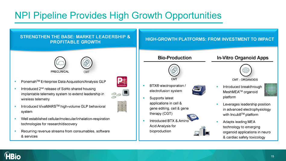 STRENGTHEN THE BASE: MARKET LEADERSHIP & PROFITABLE GROWTH HIGH - GROWTH PLATFORMS: FROM INVESTMENT TO IMPACT CMT - ORGANOIDS CMT PRECLINICAL Bio - Production In - Vitro Organoid Apps 15 NPI Pipeline Provides High Growth Opportunities ▪ Ponemah TM Enterprise Data Acquisition/Analysis GLP ▪ Introduced 2 nd release of SoHo shared housing implantable telemetry system to extend leadership in wireless telemetry ▪ Introduced VivaMARS TM high - volume GLP behavioral system ▪ Well established cellular/molecular/inhalation - respiration technologies for research/discovery ▪ Recurring revenue streams from consumables, software & services ▪ BTX® electroporation / electrofusion system ▪ Supports latest applications in cell & gene editing, cell & gene therapy (CGT) ▪ Introduced BTX & Amino Acid Analysis for bioproduction ▪ Introduced breakthrough MeshMEA TM organoid platform ▪ Leverages leadership position in advanced electrophysiology with Incub8 TM platform ▪ Adapts leading MEA technology to emerging organoid applications in neuro & cardiac safety toxicology