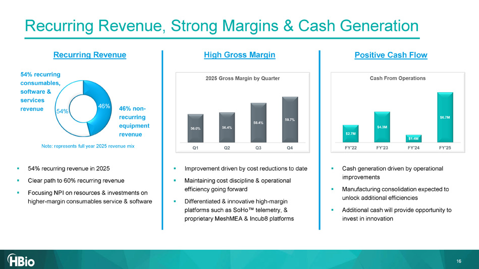 16 ▪ 54% recurring revenue in 2025 ▪ Clear path to 60% recurring revenue ▪ Focusing NPI on resources & investments on higher - margin consumables service & software 46% 54% ▪ Improvement d riven by cost reductions to date ▪ Maintaining cost discipline & operational efficiency going forward ▪ Differentiated & innovative high - margin platforms such as SoHo telemetry, & proprietary MeshMEA & Incub8 platforms 46% non - recurring equipment revenue 54 % recurring consumables, software & services revenue Note: represents full year 2025 revenue mix ▪ Cash generation driven by operational improvements ▪ Manufacturing consolidation expected to unlock additional efficiencies ▪ Additional cash will provide opportunity to invest in innovation Recurring Revenue High Gross Margin Positive Cash Flow Recurring Revenue, Strong Margins & Cash Generation