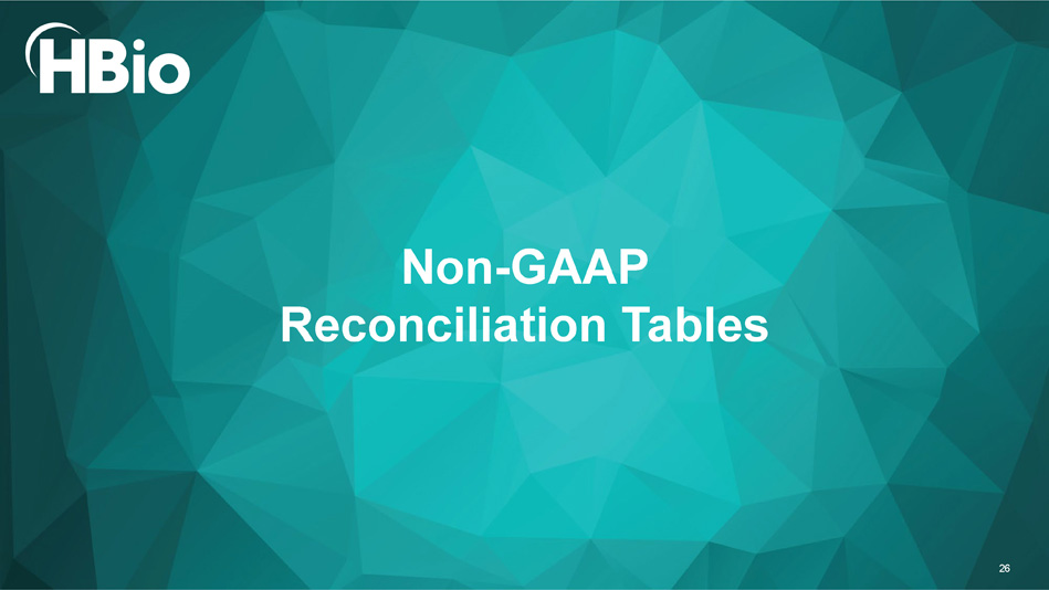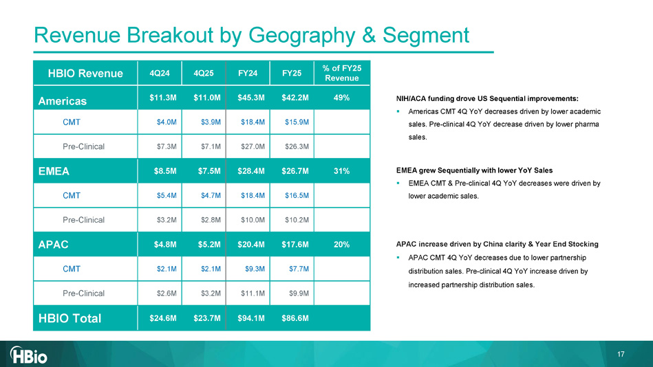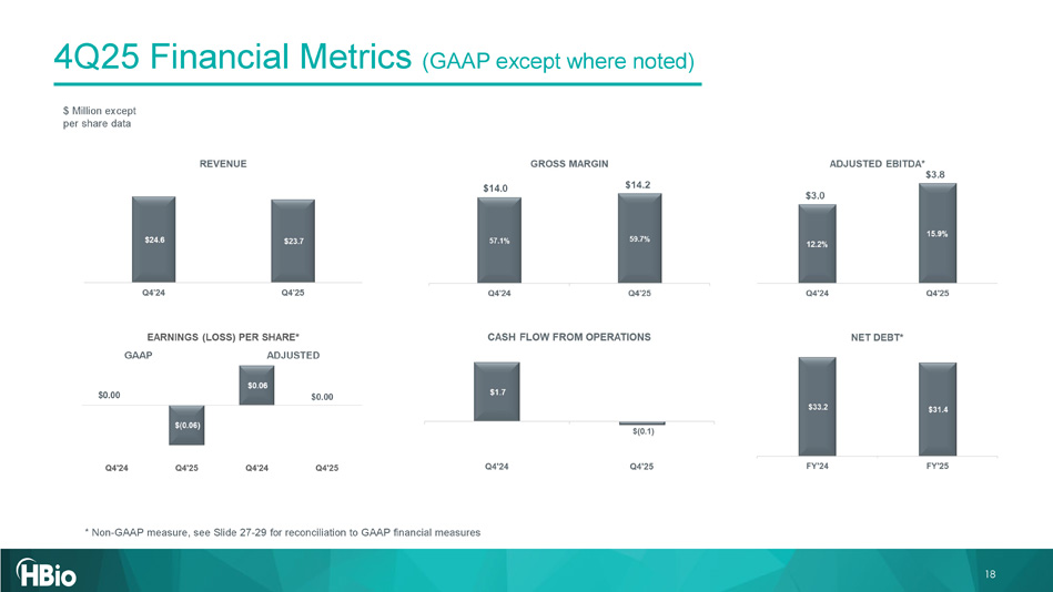 17 Revenue Breakout by Geography & Segment % of FY25 Revenue FY25 FY24 4Q25 4Q24 HBIO Revenue 49% $42.2M $45.3M $11.0M $11.3M Americas $15.9M $18.4M $3.9M $4.0M CMT $26.3M $27.0M $7.1M $7.3M Pre - Clinical 31% $26.7M $28.4M $7.5M $8.5M EMEA $16.5M $18.4M $4.7M $5.4M CMT $10.2M $10.0M $2.8M $3.2M Pre - Clinical 20% $17.6M $20.4M $5.2M $4.8M APAC $7.7M $9.3M $2.1M $2.1M CMT $9.9M $11.1M $3.2M $2.6M Pre - Clinical $86.6M $94.1M $23.7M $24.6M HBIO Total NIH/ACA funding drove US Sequential improvements: ▪ Americas CMT 4Q YoY decreases driven by lower academic sales. Pre - clinical 4Q YoY decrease driven by lower pharma sales. EMEA grew Sequentially with lower YoY Sales ▪ EMEA CMT & Pre - clinical 4Q YoY decreases were driven by lower academic sales. APAC increase driven by China clarity & Year End Stocking ▪ APAC CMT 4Q YoY decreases due to lower partnership distribution sales. Pre - clinical 4Q YoY increase driven by increased partnership distribution sales.