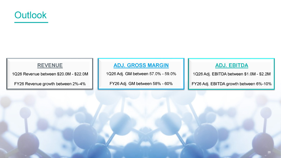 20 REVENUE ADJ. EBITDA ADJ. GROSS MARGIN 1Q26 Revenue between $20.0M - $22.0M FY26 Revenue growth between 2% - 4% 1Q26 Adj. GM between 57.0% - 59.0% FY26 Adj. GM between 58% - 60% 1Q26 Adj. EBITDA between $1.0M - $2.2M FY26 Adj. EBITDA growth between 6% - 10% Outlook