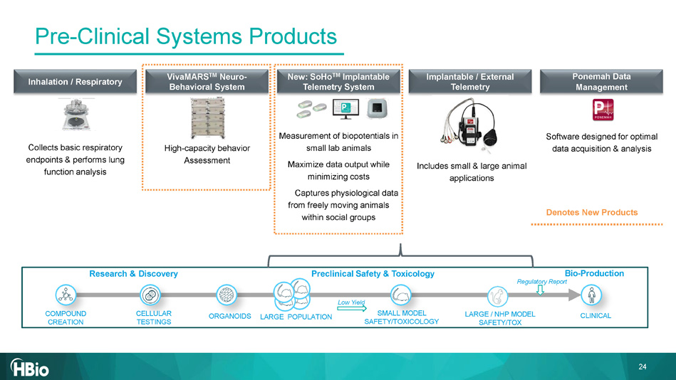 Research & Discovery Preclinical Safety & Toxicology CELLULAR TESTINGS COMPOUND CREATION CLINICAL SMALL MODEL SAFETY/TOXICOLOGY LARGE / NHP MODEL SAFETY/TOX Bio - Production Regulatory Report Low Yield ORGANOIDS LARGE POPULATION 24 Inhalation / Respiratory VivaMARS TM Neuro - Behavioral System New: SoHo TM Implantable Telemetry System Implantable / External Telemetry Collects basic respiratory endpoints & performs lung function analysis High - capacity behavior Assessment Measurement of biopotentials in small lab animals Maximize data output while minimizing costs Captures physiological data from freely moving animals within social groups Includes small & large animal applications Ponemah Data Management Software designed for optimal data acquisition & analysis Denotes New Products Pre - Clinical Systems Products