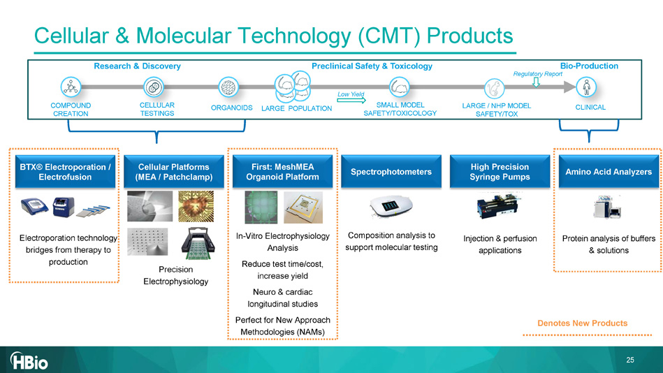 Research & Discovery Preclinical Safety & Toxicology CELLULAR TESTINGS COMPOUND CREATION CLINICAL SMALL MODEL SAFETY/TOXICOLOGY LARGE / NHP MODEL SAFETY/TOX Bio - Production Regulatory Report Low Yield ORGANOIDS LARGE POPULATION 25 BTX® Electroporation / Electrofusion Electroporation technology bridges from therapy to production Cellular Platforms (MEA / Patchclamp ) Precision Electrophysiology First: MeshMEA Organoid Platform In - Vitro Electrophysiology Analysis Reduce test time/cost, increase yield Neuro & cardiac longitudinal studies Perfect for New Approach Methodologies (NAMs) Spectrophotometers Composition analysis to support molecular testing High Precision Syringe Pumps Injection & perfusion applications Amino Acid Analyzers Protein analysis of buffers & solutions Denotes New Products Cellular & Molecular Technology (CMT) Products