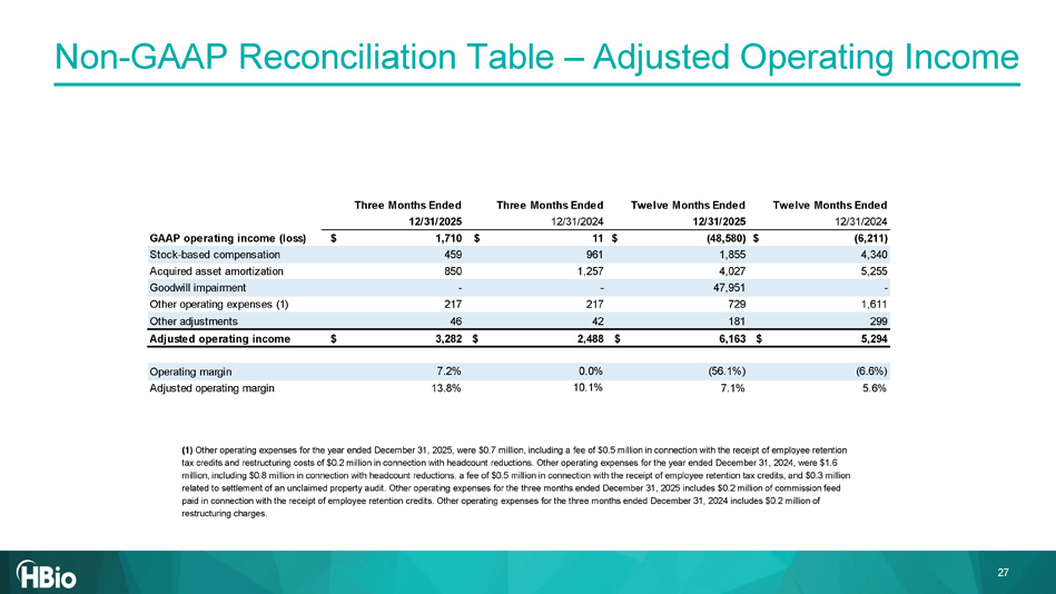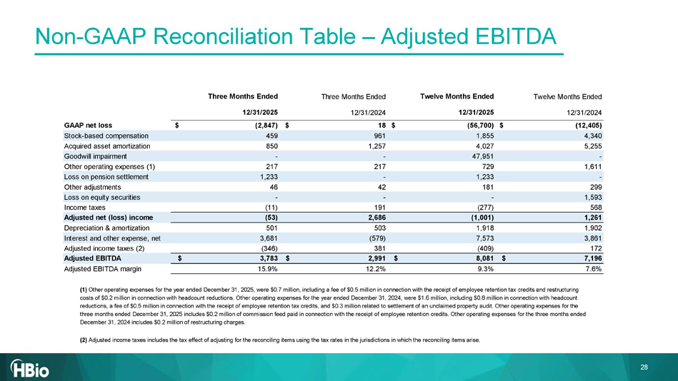 27 (1) Other operating expenses for the year ended December 31, 2025, were $0.7 million, including a fee of $0.5 million in connecti on with the receipt of employee retention tax credits and restructuring costs of $0.2 million in connection with headcount reductions. Other operating expenses for the ye ar ended December 31, 2024, were $1.6 million, including $0.8 million in connection with headcount reductions, a fee of $0.5 million in connection with the receipt of employee retention tax credits, and $0.3 million related to settlement of an unclaimed property audit. Other operating expenses for the three months ended December 31, 2025 i ncl udes $0.2 million of commission feed paid in connection with the receipt of employee retention credits. Other operating expenses for the three months ended Decemb er 31, 2024 includes $0.2 million of restructuring charges. Non - GAAP Reconciliation Table – Adjusted Operating Income Three Months Ended Three Months Ended Twelve Months Ended Twelve Months Ended 12/31/2025 12/31/2024 12/31/2025 12/31/2024 GAAP operating income (loss) $ 1,710 $ 11 $ (48,580) $ (6,211) Stock-based compensation 459 961 1,855 4,340 Acquired asset amortization 850 1,257 4,027 5,255 Goodwill impairment - - 47,951 - Other operating expenses (1) 217 217 729 1,611 Other adjustments 46 42 181 299 Adjusted operating income $ 3,282 $ 2,488 $ 6,163 $ 5,294 Operating margin 7.2% 0.0% (56.1%) (6.6%) Adjusted operating margin 13.8% 10.1% 7.1% 5.6%