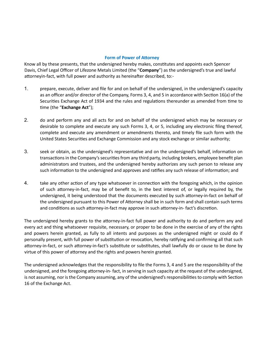 Form of Power of Attorney Know all by these presents, that the undersigned hereby makes, constitutes and appoints each Spencer Davis, Chief Legal Officer of Lifezone Metals Limited (the “Company”) as the undersigned’s true and lawful attorneyin-fact, with full power and authority as hereinafter described, to:- 1. prepare, execute, deliver and file for and on behalf of the undersigned, in the undersigned’s capacity as an officer and/or director of the Company, Forms 3, 4, and 5 in accordance with Section 16(a) of the Securities Exchange Act of 1934 and the rules and regulations thereunder as amended from time to time (the “Exchange Act”); 2. do and perform any and all acts for and on behalf of the undersigned which may be necessary or desirable to complete and execute any such Forms 3, 4, or 5, including any electronic filing thereof, complete and execute any amendment or amendments thereto, and timely file such form with the United States Securities and Exchange Commission and any stock exchange or similar authority; 3. seek or obtain, as the undersigned’s representative and on the undersigned’s behalf, information on transactions in the Company’s securities from any third party, including brokers, employee benefit plan administrators and trustees, and the undersigned hereby authorizes any such person to release any such information to the undersigned and approves and ratifies any such release of information; and 4. take any other action of any type whatsoever in connection with the foregoing which, in the opinion of such attorney-in-fact, may be of benefit to, in the best interest of, or legally required by, the undersigned, it being understood that the documents executed by such attorney-in-fact on behalf of the undersigned pursuant to this Power of Attorney shall be in such form and shall contain such terms and conditions as such attorney-in-fact may approve in such attorney-in- fact’s discretion. The undersigned hereby grants to the attorney-in-fact full power and authority to do and perform any and every act and thing whatsoever requisite, necessary, or proper to be done in the exercise of any of the rights and powers herein granted, as fully to all intents and purposes as the undersigned might or could do if personally present, with full power of substitution or revocation, hereby ratifying and confirming all that such attorney-in-fact, or such attorney-in-fact’s substitute or substitutes, shall lawfully do or cause to be done by virtue of this power of attorney and the rights and powers herein granted. The undersigned acknowledges that the responsibility to file the Forms 3, 4 and 5 are the responsibility of the undersigned, and the foregoing attorney-in- fact, in serving in such capacity at the request of the undersigned, is not assuming, nor is the Company assuming, any of the undersigned’s responsibilities to comply with Section 16 of the Exchange Act.