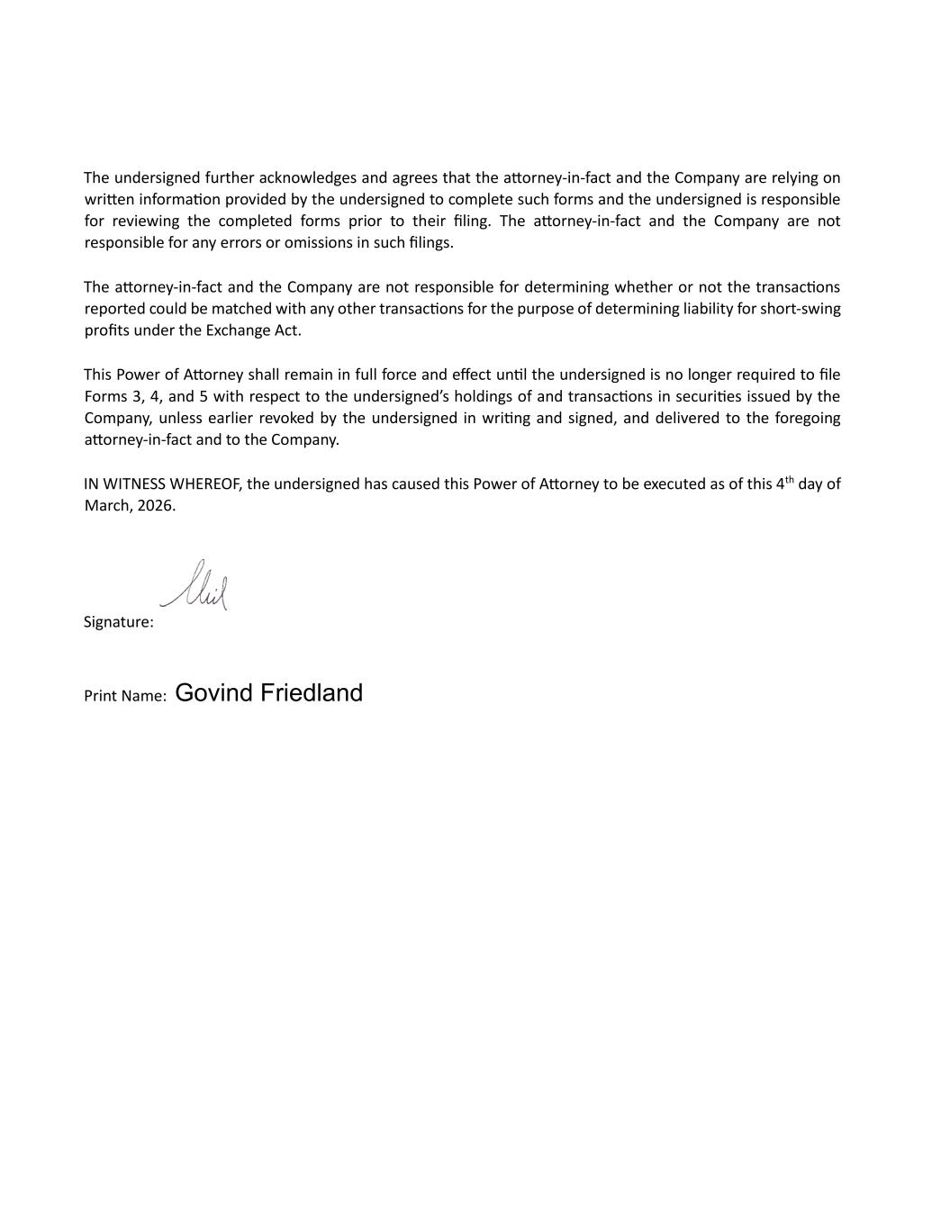 The undersigned further acknowledges and agrees that the attorney-in-fact and the Company are relying on written information provided by the undersigned to complete such forms and the undersigned is responsible for reviewing the completed forms prior to their filing. The attorney-in-fact and the Company are not responsible for any errors or omissions in such filings. The attorney-in-fact and the Company are not responsible for determining whether or not the transactions reported could be matched with any other transactions for the purpose of determining liability for short-swing profits under the Exchange Act. This Power of Attorney shall remain in full force and effect until the undersigned is no longer required to file Forms 3, 4, and 5 with respect to the undersigned’s holdings of and transactions in securities issued by the Company, unless earlier revoked by the undersigned in writing and signed, and delivered to the foregoing attorney-in-fact and to the Company. IN WITNESS WHEREOF, the undersigned has caused this Power of Attorney to be executed as of this 4th day of March, 2026. Signature: Print Name: Govind Friedland