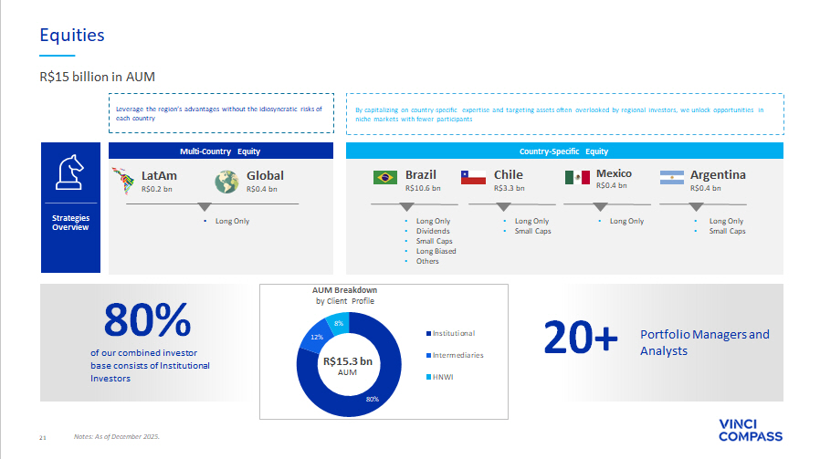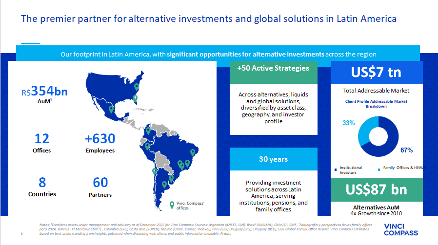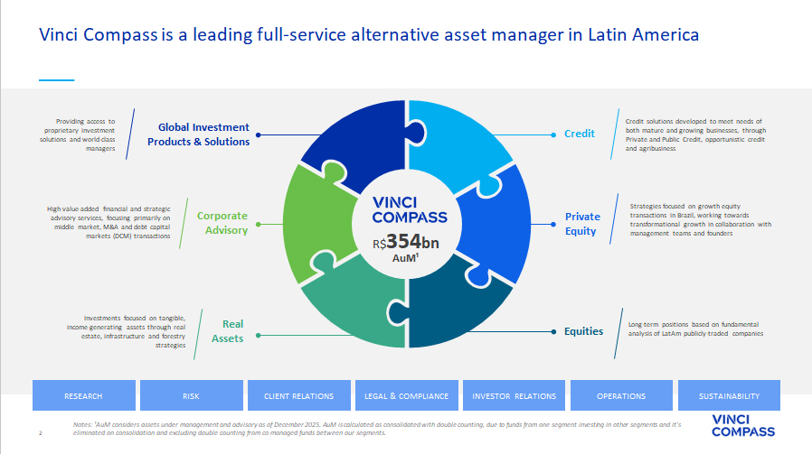 2 Vinci Compass is a leading full - service alternative asset manager in Latin America Credit Private Equity Equities Global Investment Products & Solutions Real Assets Strategies focused on growth equity transactions in Brazil, working towards transformational growth in collaboration with management teams and founders Credit solutions developed to meet needs of both mature and growing businesses, through Private and Public Credit, opportunistic credit and agribusiness Long - term positions based on fundamental analysis of LatAm publicly - traded companies Investments focused on tangible, income - generating assets through real estate, infrastructure and forestry strategies High value - added financial and strategic advisory services, focusing primarily on middle market, M&A and debt capital markets (DCM) transactions Providing access to proprietary investment solutions and world - class managers RESEARCH RISK LEGAL & COMPLIANCE INVESTOR RELATIONS OPERATIONS SUSTAINABILITY CLIENT RELATIONS Notes: ¹AuM considers assets under management and advisory as of December 2025. AuM is calculated as consolidated with double co unting, due to funds from one segment investing in other segments and it’s eliminated on consolidation and excluding double counting from co - managed funds between our segments. Corporate Advisory R$ 354 bn AuM¹