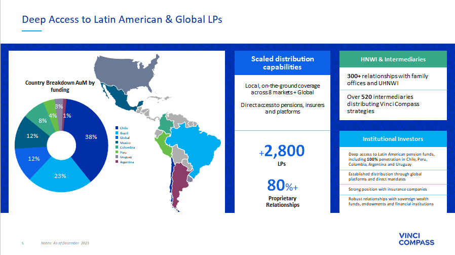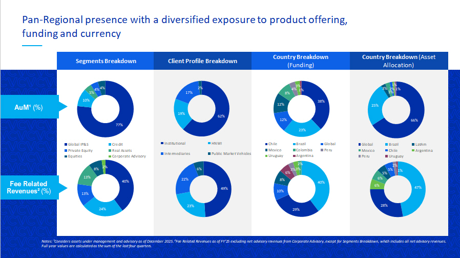 4 Pan - Regional presence with a diversified exposure to product offering, funding and currency Segments Breakdown Country Breakdown (Funding) Client Profile Breakdown Country Breakdown (Asset Allocation) Notes: ¹ Considers assets under management and advisory as of December 2025. ²Fee Related Revenues as of FY’25 excluding net advisory rev enues from Corporate Advisory, except for Segments Breakdown, which includes all net advisory revenues. Full - year values are calculated as the sum of the last four quarters. 62% 19% 17% 2% Institutional HNWI Intermediaries Public Market Vehicles 77% 10% 5% 4% 4% 38% 23% 12% 12% 8% 4% 3% 1% Chile Brazil Global Mexico Colombia Peru Uruguay Argentina 66% 25% 3% 3% 2% 1% 1% Global Brazil LatAm Mexico Chile Argentina Peru Uruguay 40% 24% 13% 13% 8% 2% Global IP&S Credit Private Equity Real Assets Equities Corporate Advisory 49% 23% 22% 6% 47% 28% 6% 6% 5% 5% 2% 1% 40% 29% 10% 8% 6% 3% 3% 2% AuM¹ (%) Fee Related Revenues² (%)