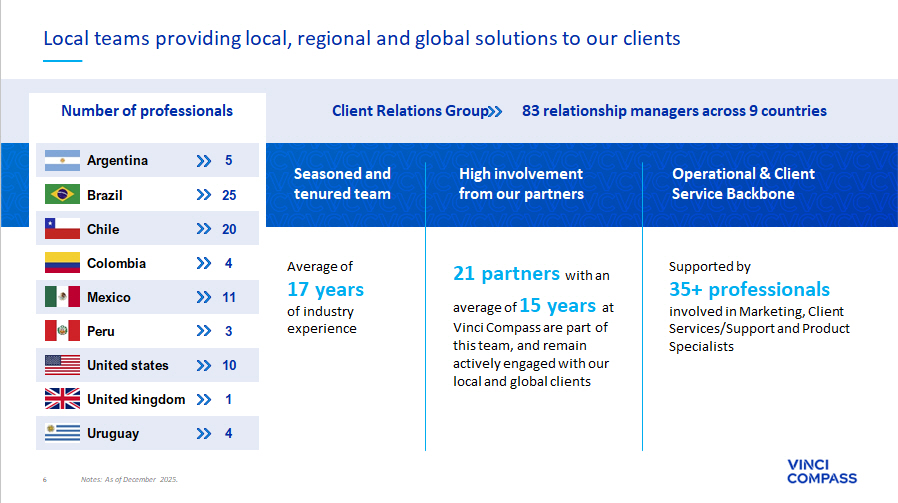 6 Notes: As of December 2025. Local teams providing local, regional and global solutions to our clients Operational & Client Service Backbone High involvement from our partners Client Relations Group 83 relationship managers across 9 countries 5 Argentina 25 Brazil 20 Chile 4 Colombia 11 Mexico 3 Peru 10 United states 1 United kingdom 4 Uruguay Number of professionals Average of 17 years of industry experience Seasoned and tenured team 21 partners with an average of 15 years at Vinci Compass are part of this team, and remain actively engaged with our local and global clients Supported by 35+ professionals involved in Marketing, Client Services/Support and Product Specialists