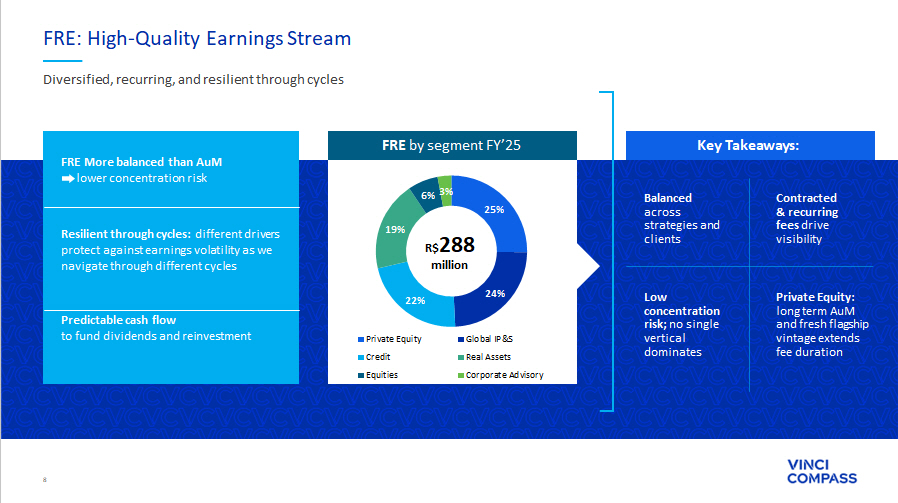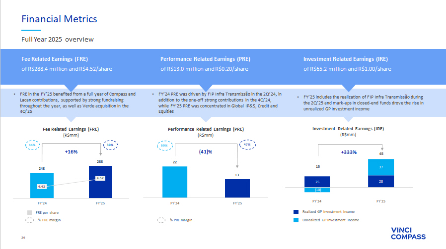 36 25 28 (10) 37 15 65 FY'24 FY'25 22 13 FY'24 FY'25 248 288 FY'24 FY'25 Financial Metrics Full Year 2025 overview Fee Related Earnings (FRE) of R$288.4 million and R$4.52/share • FRE in the FY’25 benefited from a full year of Compass and Lacan contributions, supported by strong fundraising throughout the year, as well as Verde acquisition in the 4Q’25 Performance Related Earnings (PRE) of R$13.0 million and R$0.20/share • FY’24 PRE was driven by FIP Infra Transmissão in the 2Q’24, in addition to the one - off strong contributions in the 4Q’24, while FY’25 PRE was concentrated in Global IP&S, Credit and Equities Investment Related Earnings (IRE) of R$65.2 million and R$1.00/share • FY’25 includes the realization of FIP Infra Transmissão during the 2Q’25 and mark - ups in closed - end funds drove the rise in unrealized GP investment income +16% % FRE margin FRE per share Fee Related Earnings (FRE) (R$mm) 30% 44 % 4.42 4.52 Performance Related Earnings (PRE) (R$mm) 47% 59% (41)% % PRE margin Investment Related Earnings (IRE) (R$mm) +333% Realized GP Investment Income Unrealized GP Investment Income