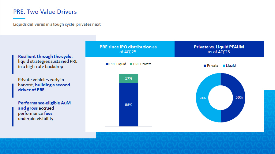 9 PRE: Two Value Drivers Liquids delivered in a tough cycle, privates next Resilient through the cycle: liquid strategies sustained PRE in a high - rate backdrop Private vehicles early in harvest, building a second driver of PRE Performance - eligible AuM and gross accrued performance fees underpin visibility PRE since IPO distribution as of 4Q’25 83% 17% PRE Liquid PRE Private Private vs. Liquid PEAUM as of 4Q’25 50% 50% Private Liquid