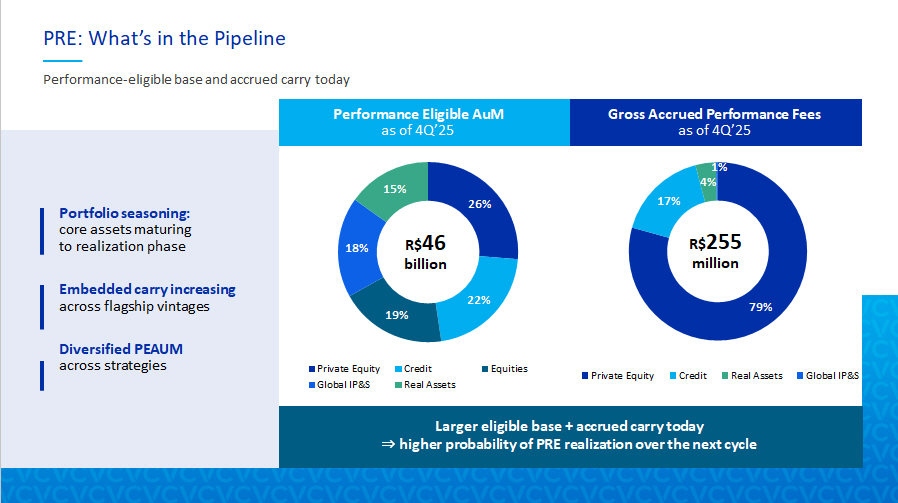 10 PRE: What’s in the Pipeline Performance - eligible base and accrued carry today Portfolio seasoning: core assets maturing to realization phase Embedded carry increasing across flagship vintages Diversified PEAUM across strategies Performance Eligible AuM as of 4Q’25 R$ 46 billion Larger eligible base + accrued carry today ⇒ higher probability of PRE realization over the next cycle Gross Accrued Performance Fees as of 4Q’25 R$ 255 million 26% 22% 19% 18% 15% Private Equity Credit Equities Global IP&S Real Assets 79% 17% 4% 1% Private Equity Credit Real Assets Global IP&S