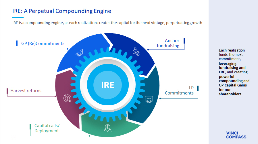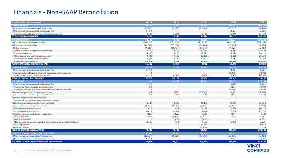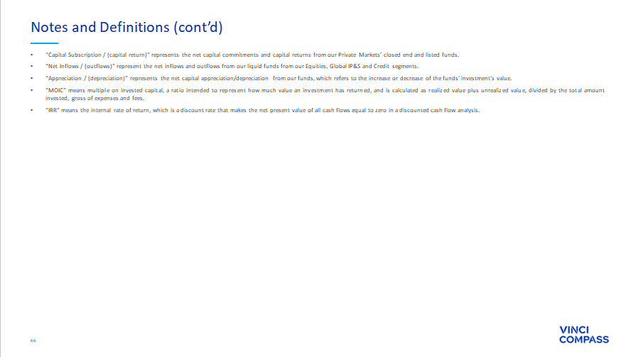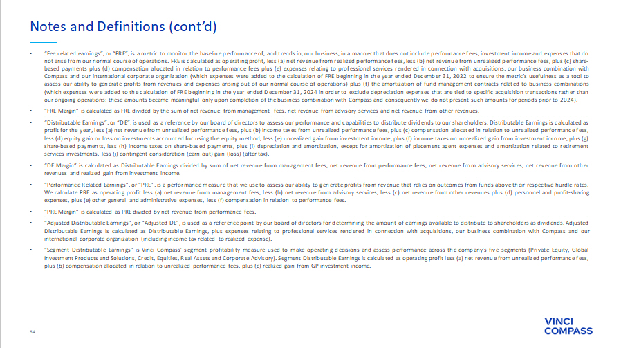 64 • “Fee related earnings”, or “FRE”, is a metric to monitor the baseline performance of, and trends in, our business, in a manner that does not include performance fees, investment income and expenses that do not arise from our normal course of operations . FRE is calculated as operating profit, less (a) net revenue from realized performance fees, less (b) net revenue from unrealized performance fees, plus (c) share - based payments plus (d) compensation allocated in relation to performance fees plus (e) expenses relating to professional services rendered in connection with acquisitions, our business combination with Compass and our international corporate organization (which expenses were added to the calculation of FRE beginning in the year ended December 31 , 2022 to ensure the metric’s usefulness as a tool to assess our ability to generate profits from revenues and expenses arising out of our normal course of operations) plus (f) the amortization of fund management contracts related to business combinations (which expenses were added to the calculation of FRE beginning in the year ended December 31 , 2024 in order to exclude depreciation expenses that are tied to specific acquisition transactions rather than our ongoing operations ; these amounts became meaningful only upon completion of the business combination with Compass and consequently we do not present such amounts for periods prior to 2024 ) . • “FRE Margin” is calculated as FRE divided by the sum of net revenue from management fees, net revenue from advisory services and net revenue from other revenues . • “Distributable Earnings”, or “DE”, is used as a reference by our board of directors to assess our performance and capabilities to distribute dividends to our shareholders . Distributable Earnings is calculated as profit for the year, less (a) net revenue from unrealized performance fees, plus (b) income taxes from unrealized performance fees, plus (c) compensation allocated in relation to unrealized performance fees, less (d) equity gain or loss on investments accounted for using the equity method, less (e) unrealized gain from investment income, plus (f) income taxes on unrealized gain from investment income, plus (g) share - based payments, less (h) income taxes on share - based payments, plus (i) depreciation and amortization, except for amortization of placement agent expenses and amortization related to retirement services investments, less (j) contingent consideration (earn - out) gain (loss) (after tax) . • “DE Margin” is calculated as Distributable Earnings divided by sum of net revenue from management fees, net revenue from performance fees, net revenue from advisory services, net revenue from other revenues and realized gain from investment income . • “Performance Related Earnings”, or “PRE”, is a performance measure that we use to assess our ability to generate profits from revenue that relies on outcomes from funds above their respective hurdle rates . We calculate PRE as operating profit less (a) net revenue from management fees, less (b) net revenue from advisory services, less (c) net revenue from other revenues plus (d) personnel and profit - sharing expenses, plus (e) other general and administrative expenses, less (f) compensation in relation to performance fees . • “PRE Margin” is calculated as PRE divided by net revenue from performance fees . • “Adjusted Distributable Earnings”, or “Adjusted DE”, is used as a reference point by our board of directors for determining the amount of earnings available to distribute to shareholders as dividends . Adjusted Distributable Earnings is calculated as Distributable Earnings, plus expenses relating to professional services rendered in connection with acquisitions, our business combination with Compass and our international corporate organization (including income tax related to realized expense) . • “Segment Distributable Earnings” is Vinci Compass’ segment profitability measure used to make operating decisions and assess performance across the company’s five segments (Private Equity, Global Investment Products and Solutions, Credit, Equities, Real Assets and Corporate Advisory) . Segment Distributable Earnings is calculated as operating profit less (a) net revenue from unrealized performance fees, plus (b) compensation allocated in relation to unrealized performance fees, plus (c) realized gain from GP investment income . Notes and Definitions (cont’d)