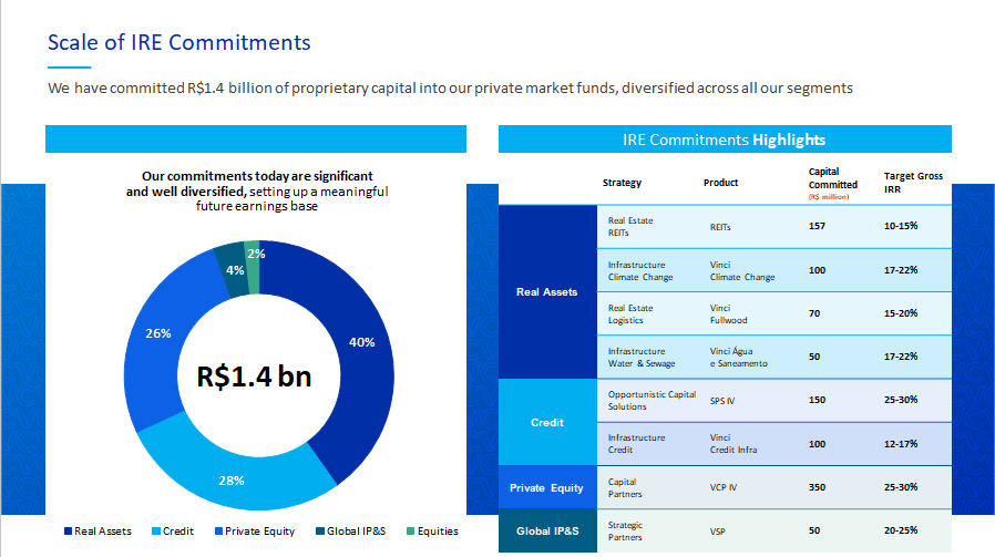 12 Scale of IRE Commitments We have committed R$1.4 billion of proprietary capital into our private market funds, diversified across all our segments Our commitments today are significant and well diversified, setting up a meaningful future earnings base IRE Commitments Highlights Target Gross IRR Capital Committed (R$ million) Product Strategy 10 - 15% 157 REITs Real Estate REITs Real Assets 17 - 22% 100 Vinci Climate Change Infrastructure Climate Change 15 - 20% 70 Vinci Fullwood Real Estate Logistics 17 - 22% 50 Vinci Água e Saneamento Infrastructure Water & Sewage 25 - 30% 150 SPS IV Opportunistic Capital Solutions Credit 12 - 17% 100 Vinci Credit Infra Infrastructure Credit 25 - 30% 350 VCP IV Capital Partners Private Equity 20 - 25% 50 VSP Strategic Partners Global IP&S R$1.4 bn 40% 28% 26% 4% 2% Real Assets Credit Private Equity Global IP&S Equities