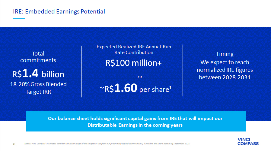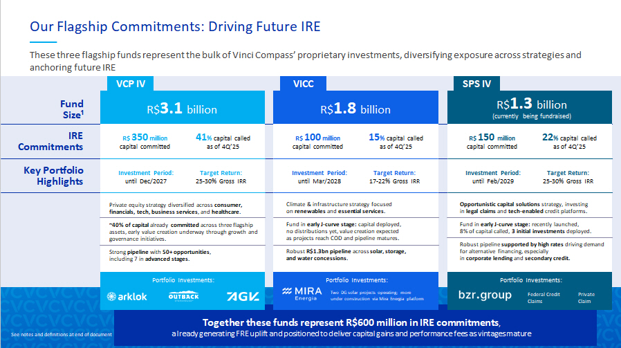 13 Our Flagship Commitments: Driving Future IRE These three flagship funds represent the bulk of Vinci Compass’ proprietary investments, diversifying exposure across strateg ies and anchoring future IRE Together these funds represent R$600 million in IRE commitments , already generating FRE uplift and positioned to deliver capital gains and performance fees as vintages mature Fund Size¹ IRE Commitments Key Portfolio Highlights VCP IV R$ 3.1 billion R$ 350 million capital committed Investment Period: until Dec/2027 Private equity strategy diversified across consumer, financials, tech, business services , and healthcare . ~40% of capital already committed across three flagship assets, early value creation underway through growth and governance initiatives. Strong pipeline with 50+ opportunities , including 7 in advanced stages . Portfolio Investments: 41 % capital called as of 4Q’25 Target Return: 25 - 30% Gross IRR VICC R$ 1.8 billion R$ 100 million capital committed Investment Period: until Mar/2028 Portfolio Investments: 15 % capital called as of 4Q’25 Target Return: 17 - 22% Gross IRR Two DG solar projects operating; more under construction via Mira Energia platform Climate & infrastructure strategy focused on renewables and essential services . Fund in early J - curve stage: capital deployed, no distributions yet, value creation expected as projects reach COD and pipeline matures. Robust R$1.3bn pipeline across solar, storage, and water concessions . SPS IV R$ 1.3 billion (currently being fundraised) R$ 150 million capital committed Investment Period: until Feb/2029 22 % capital called as of 4Q’25 Target Return: 25 - 30% Gross IRR Opportunistic capital solutions strategy, investing in legal claims and tech - enabled credit platforms. Fund in early J - curve stage: recently launched, 8% of capital called, 3 initial investments deployed. Robust pipeline supported by high rates driving demand for alternative financing, especially in corporate lending and secondary credit. Federal Credit Claims Private Claim Portfolio Investments: See notes and definitions at end of document