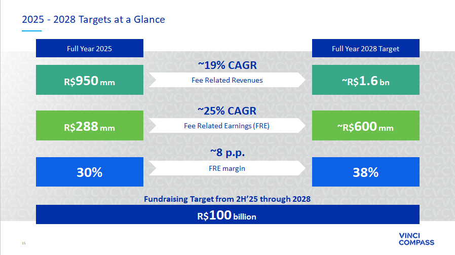 14 Notes: Vinci Compass’ estimates consider the lower range of the target net IRR from our proprietary capital commitments; ¹Con sid ers the share base as of September 2025. IRE: Embedded Earnings Potential R$ 1.4 billion 18 - 20% Gross Blended Target IRR Total commitments Our balance sheet holds significant capital gains from IRE that will impact our Distributable Earnings in the coming years R$100 million+ Expected Realized IRE Annual Run Rate Contribution ~R$ 1.60 per share¹ or We expect to reach normalized IRE figures between 2028 - 2031 Timing