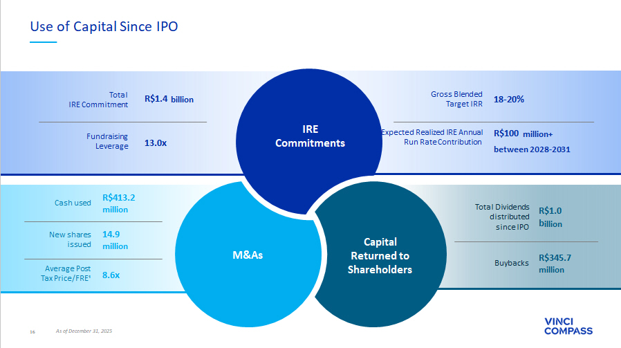 16 As of December 31, 2025 Use of Capital Since IPO 18 - 20% R$100 million+ between 2028 - 2031 IRE Commitments Capital Returned to Shareholders M&As Gross Blended Target IRR Expected Realized IRE Annual Run Rate Contribution R$413.2 m illion Cash used R$1.0 b illion Total Dividends distributed since IPO R$345.7 million 14.9 million 8.6x Buybacks R$1.4 billion 13.0x Total IRE Commitment New shares issued Average Post Tax Price/FRE¹ Fundraising Leverage