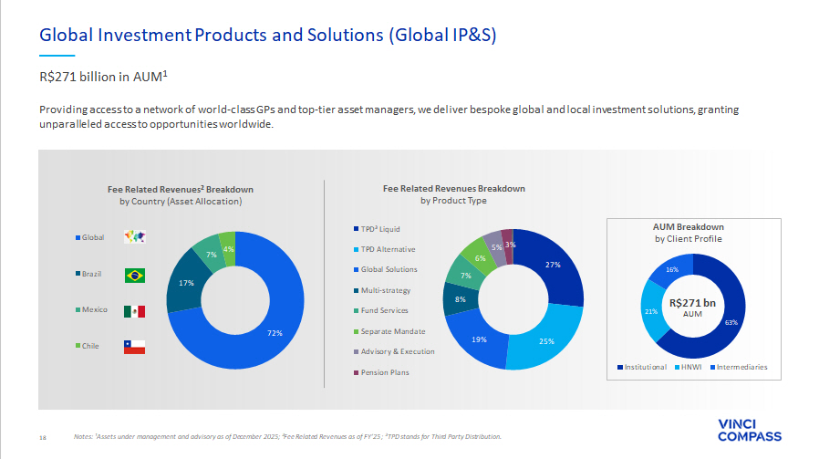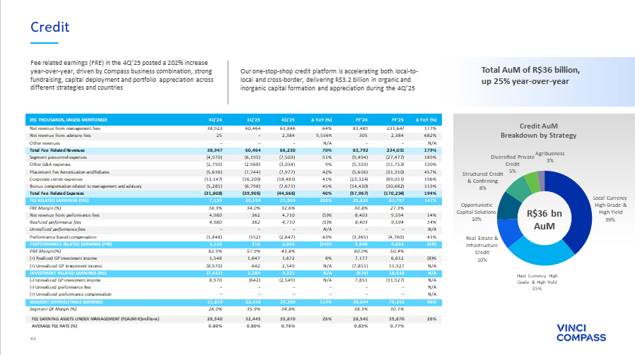 42 See notes and definitions at end of document TPD Liquid 47% TPD Alternative 28% Multi - strategy 12% Global Solutions 7% Advisory & Execution 3% Pension Plans 1% Fund Services 1% Global IP&S AuM Breakdown by Strategy Global Investment Products & Solutions (Global IP&S) R$271 bn AuM Fee Related Earnings (FRE) of R$69.1 million in the FY’25, up 139% YoY, driven mostly by the growth in management fees following the combination with Compass and the acquisition of Verde Advisory fees of R$63.7 million in the FY’25, an increase of 235% year - over - year, from upfront fees¹ charged in TPD² Alternative strategy Global IP&S AuM was R$271.5 billion in the 4Q’25, with R$14.5 billion from the acquisition of Verde, R$4.6 billion in net inflows and R$11.3 billion across appreciation and FX variation ∆ YoY (%) FY'25 FY'24 ∆ YoY (%) 4Q'25 3Q'25 4Q'24 (R$ THOUSANDS, UNLESS MENTIONED) 162% 267,214 101,945 78% 77,943 63,956 43,857 Net revenue from management fees 235% 63,714 19,045 (68)% 5,755 17,886 17,988 Net revenue from advisory fees 479% 44,869 7,745 53% 11,819 11,216 7,745 Other revenues 192% 375,797 128,737 37% 95,516 93,058 69,590 Total Fee Related Revenues 130% (24,871) (10,798) 85% (7,467) (5,265) (4,036) Segment personnel expenses 118% (32,423) (14,867) 46% (9,238) (7,759) (6,330) Other G&A expenses 499% (39,755) (6,633) 61% (10,669) (9,964) (6,633) Placement Fee Amortization and Rebates 245% (158,817) (46,068) 17% (38,451) (38,349) (32,747) Corporate center expenses 138% (50,821) (21,397) 69% (9,703) (16,101) (5,729) Bonus compensation related to management and advisory 207% (306,687) (99,762) 36% (75,528) (77,438) (55,474) Total Fee Related Expenses 139% 69,110 28,974 42% 19,988 15,620 14,116 FEE RELATED EARNINGS (FRE) 18.4% 22.5% 20.9% 16.8% 20.3% FRE Margin (%) (41)% 8,897 15,006 (53)% 6,856 211 14,636 Net revenue from performance fees (41)% 8,897 15,006 (53)% 6,856 211 14,636 Realized performance fees N/A – – N/A – – – Unrealized performance fees 10% (5,342) (4,838) (4)% (4,454) (60) (4,619) Performance based compensation (65)% 3,555 10,169 (76)% 2,402 151 10,017 PERFORMANCE RELATED EARNINGS (PRE) 40.0% 67.8% 35.0% 71.6% 68.4% PRE Margin (%) 96% 964 493 2,860% 272 – 9 (+) Realized GP investment income (92)% 462 5,499 (72)% 586 565 2,057 (+) Unrealized GP investment income (76)% 1,426 5,993 (58)% 858 565 2,067 INVESTMENT RELATED EARNINGS (IRE) (92)% (462) (5,499) (72)% (586) (565) (2,057) ( - ) Unrealized GP investment income N/A – – N/A – – – ( - ) Unrealized performance fees N/A – – N/A – – – (+) Unrealized performance compensation 86% 73,630 39,637 (6)% 22,662 15,771 24,142 SEGMENT DISTRIBUTABLE EARNINGS 19.1% 27.5% 22.1% 16.9% 28.7% Segment DE Margin (%) 6% 270,156 254,004 6% 270,156 239,978 254,004 FEE EARNING ASSETS UNDER MANAGEMENT (FEAUM R$millions ) 0.13% 0.25% 0.15% 0.13% 0.20% AVERAGE FEE RATE (%) 14% 220,403 193,984 14% 220,403 191,957 193,984 FEE EARNING ASSETS UNDER MANAGEMENT (FEAUM R$millions) EX - UPFRONTS 4 0.17% 0.25% 0.18% 0.16% 0.20% AVERAGE FEE RATE (%) EX - UPFRONTS