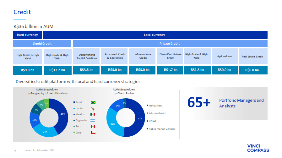 18 63% 21% 16% AUM Breakdown by Client Profile Institutional HNWI Intermediaries Global Investment Products and Solutions (Global IP&S) Providing access to a network of world - class GPs and top - tier asset managers, we deliver bespoke global and local investment solutions, granting unparalleled access to opportunities worldwide. R$271 bn AUM R $ 271 billion in AUM 1 Notes: ¹Assets under management and advisory as of December 2025; ²Fee Related Revenues as of FY’25 ; ³TPD stands for Third P art y Distribution. 27% 25% 19% 8% 7% 6% 5% 3% Fee Related Revenues Breakdown by Product Type TPD³ Liquid TPD Alternative Global Solutions Multi-strategy Fund Services Separate Mandate Advisory & Execution Pension Plans 72% 17% 7% 4% Fee Related Revenues² Breakdown by Country (Asset Allocation) Global Brazil Mexico Chile