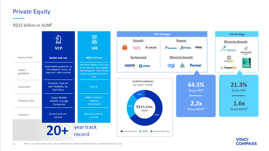 20 66% 23% 12% AUM Breakdown by Client Profile Institutional HNWI Intermediaries R $ 15 billion in AUM¹ Private Equity 2.2x Gross MOIC² 64.5% Gross IRR² R$15.4 bn AUM &UHDWHGE\&KDQXWLV,QGXVWULHV IURPWKH1RXQ3URMHFW &UHDWHGE\'LQRVRIW/DEV IURPWKH1RXQ3URMHFW VIR VCP Impact guidelines Investment Company Size Influence Sustainability guidelines as risk mitigators drivers of long - term value creation Primarily Cash Ins with flexibility for Cash Outs Upper Middle Market to Large Companies Control and co - control Cash In SMEs (small - to - medium enterprises) Minority with co - control Generates impact at the core of the business and supports SME companies with limited access to capital and know - how 20+ 1.6x Gross MOIC² 21.3% Gross IRR² year track record Buyout Growth Turnaround Minority Growth VCP Strategy Notes: ¹As of December 2025; ²Gross IRR and Gross MOIC in Brazilian Reais, as of September 30, 2025. Turnaround VIR Strategy Minority Growth Equity Check R$300 - 500 mm R$50 - 150 mm