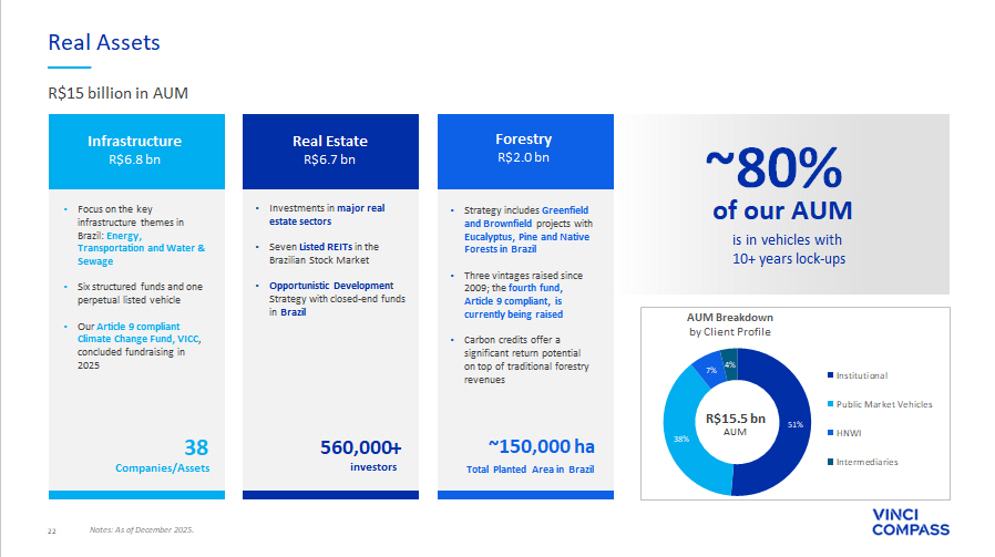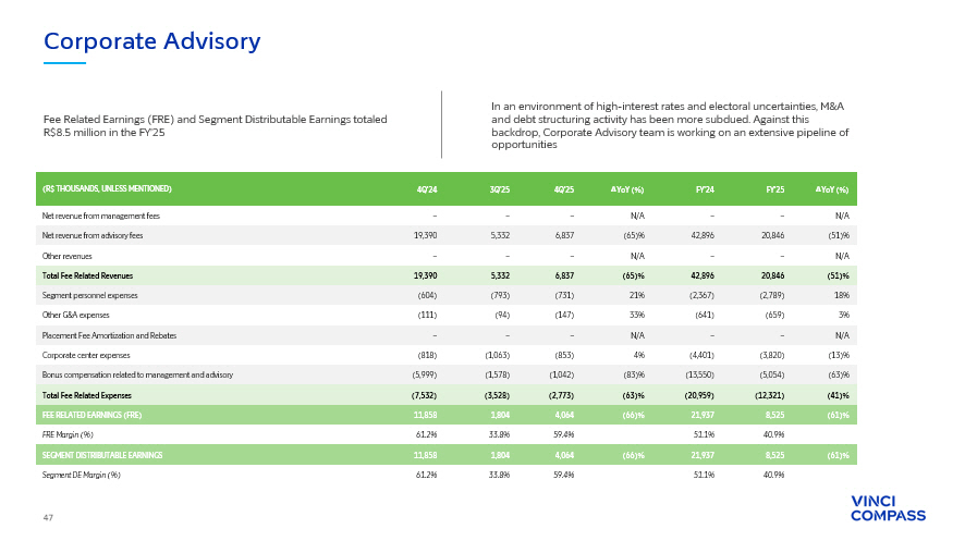 46 Infrastructure 44% Real Estate 43% Forestry 13% Real Assets AuM Breakdown by Strategy Real Assets Total AuM of R$15 billion, up 32% year - over - year R$15 bn AuM Fee Related Earnings of R$55.5 million in the FY’25, up 7% year - over - year, driven by higher Fee Related Revenues, including the catch - up fees from VICC’s final closing in the 2Q’25 and acquisition of Lacan in the 4Q’24. In the 4Q’25, Real Assets posted R$3.6 billion in capital formation and appreciation, including R$2.8 billion of committed capital from an institutional investor via an Infrastructure SMA. As capital is deployed, the SMA will be activated as Fee - Earning AuM ∆ YoY (%) FY'25 FY'24 ∆ YoY (%) 4Q'25 3Q'25 4Q'24 (R$ THOUSANDS, UNLESS MENTIONED) 20% 116,189 97,183 11% 28,294 28,934 25,552 Net revenue from management fees 0% 4,957 4,939 (76)% 468 2,167 1,976 Net revenue from advisory fees 212% 561 180 (100)% – 188 180 Other revenues 19% 121,707 102,302 4% 28,762 31,288 27,709 Total Fee Related Revenues 75% (11,818) (6,738) 17% (2,834) (2,944) (2,421) Segment personnel expenses 40% (8,151) (5,836) (49)% (1,389) (1,312) (2,732) Other G&A expenses 9% (838) (768) 14% (218) (207) (192) Placement Fee Amortization and Rebates 27% (26,700) (21,102) 30% (6,540) (6,518) (5,049) Corporate center expenses 17% (18,694) (15,932) (2)% (4,367) (5,415) (4,460) Bonus compensation related to management and advisory 31% (66,201) (50,378) 3% (15,348) (16,396) (14,855) Total Fee Related Expenses 7% 55,505 51,923 4% 13,414 14,892 12,854 FEE RELATED EARNINGS (FRE) 45.6% 50.8% 46.6% 47.6% 46.4% FRE Margin (%) (99)% 41 8,111 (100)% 39 1 7,794 Net revenue from performance fees (58)% 8,752 21,048 (100)% 39 1 17,248 Realized performance fees (33)% (8,711) (12,936) N/A – – (9,453) Unrealized performance fees (99)% (55) (4,602) (100)% (22) (1) (4,463) Performance based compensation N/A (14) 3,509 (100)% 16 1 3,331 PERFORMANCE RELATED EARNINGS (PRE) (33.5)% 43.3% 42.5% 55.8% 42.7% PRE Margin (%) (0)% 17,649 17,734 10% 2,811 2,654 2,554 (+) Realized GP investment income N/A 14,693 (12,080) 125% 17,642 137 7,835 (+) Unrealized GP investment income 472% 32,342 5,654 97% 20,453 2,791 10,390 INVESTMENT RELATED EARNINGS (IRE) N/A (14,693) 12,080 125% (17,642) (137) (7,835) ( - ) Unrealized GP investment income (33)% 8,711 12,937 (100)% – – 9,454 ( - ) Unrealized performance fees 166% (3,083) (1,159) (100)% – – 74 (+) Unrealized performance compensation (7)% 78,769 84,943 (43)% 16,241 17,547 28,268 SEGMENT DISTRIBUTABLE EARNINGS 53.2% 60.2% 51.4% 51.7% 59.5% Segment DE Margin (%) 10% 12,684 11,567 10% 12,684 11,976 11,567 FEE EARNING ASSETS UNDER MANAGEMENT (FEAUM R$millions ) 1.02% 0.95% 0.99% 1.01% 1.01% AVERAGE FEE RATE (%)
