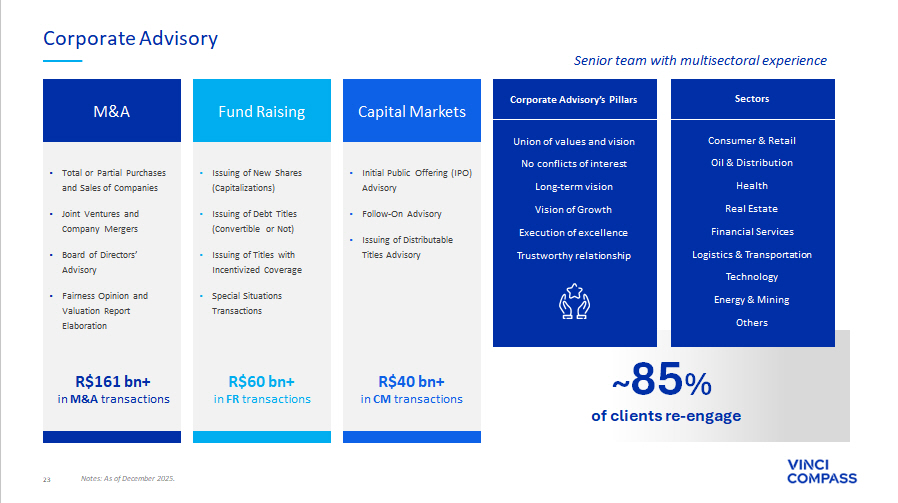 23 Notes: As of December 2025. Corporate Advisory M&A • Total or Partial Purchases and Sales of Companies • Joint Ventures and Company Mergers • Board of Directors’ Advisory • Fairness Opinion and Valuation Report Elaboration R$161 bn+ in M&A transactions Fund Raising • Issuing of New Shares (Capitalizations) • Issuing of Debt Titles (Convertible or Not) • Issuing of Titles with Incentivized Coverage • Special Situations Transactions R$60 bn+ in FR transactions Capital Markets • Initial Public Offering (IPO) Advisory • Follow - On Advisory • Issuing of Distributable Titles Advisory R$40 bn+ in CM transactions ~ 85 % of clients re - engage Corporate Advisory’s Pillars Union of values and vision No conflicts of interest Long - term vision Vision of Growth Execution of excellence Trustworthy relationship Sectors Consumer & Retail Oil & Distribution Health Real Estate Financial Services Logistics & Transportation Technology Energy & Mining Others Senior team with multisectoral experience