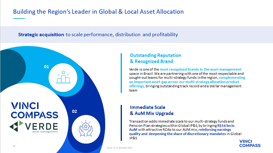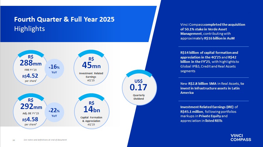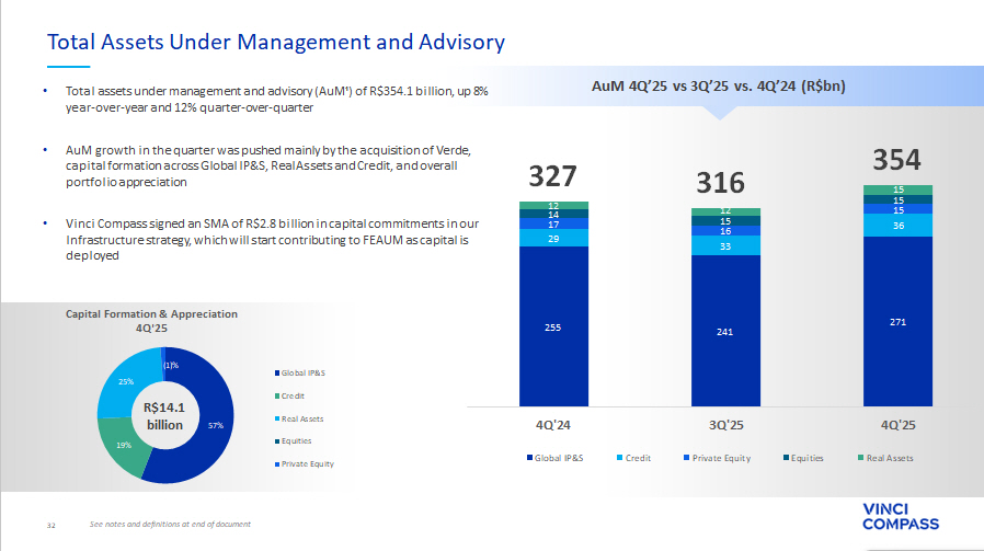 30 0.17 Quarterly Dividend US$ 14 bn Capital Formation & Appreciation 4Q’25 R$ Fourth Quarter & Full Year 2025 Highlights Vinci Compass completed the acquisition of 50.1% stake in Verde Asset Management , contributing with approximately R$16 billion in AuM R$14 billion of capital formation and appreciation in the 4Q’25 and R$42 billion in the FY’25 , with highlights to Global IP&S, Credit and Real Assets segments New R$2.8 billion SMA in Real Assets, to invest in Infrastructure assets in Latin America See notes and definitions at end of document 288 mm FRE FY’25 + 16 % YoY R$ R$ 4.52 per share¹ 292 mm Adj. DE FY’25 + 22 % YoY R$ R$ 4.58 per share² Investment Related Earnings (IRE) of R$45.1 million , following portfolios markups in Private Equity and appreciation in listed REITs 45 mn Investment Related Earnings 4Q’25 R$