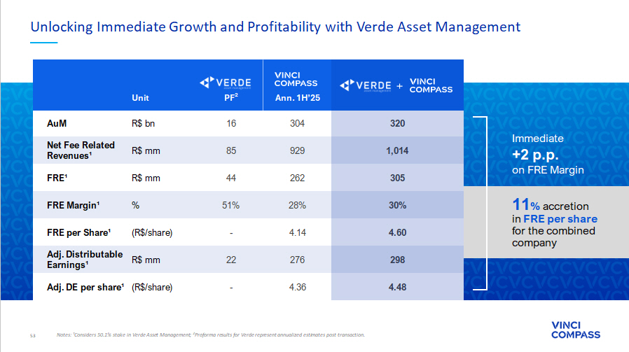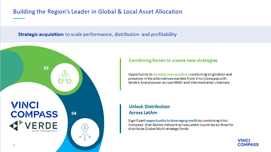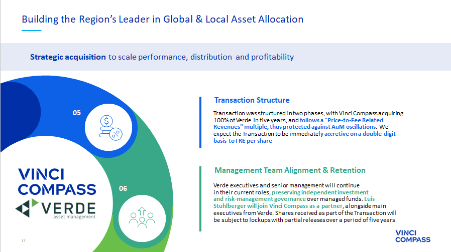 27 Verde executives and senior management will continue in their current roles, preserving independent investment and risk - management governance over managed funds. Luis Stuhlberger will join Vinci Compass as a partner , alongside main executives from Verde. Shares received as part of the Transaction will be subject to lockups with partial releases over a period of five years Management Team Alignment & Retention 05 06 Transaction was structured in two phases, with Vinci Compass acquiring 100% of Verde in five years, and follows a "Price - to - Fee Related Revenues" multiple, thus protected against AuM oscillations . We expect the Transaction to be immediately accretive on a double - digit basis to FRE per share Transaction Structure Strategic acquisition to scale performance, distribution and profitability Building the Region’s Leader in Global & Local Asset Allocation