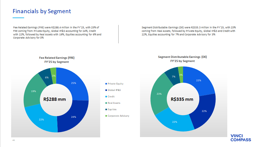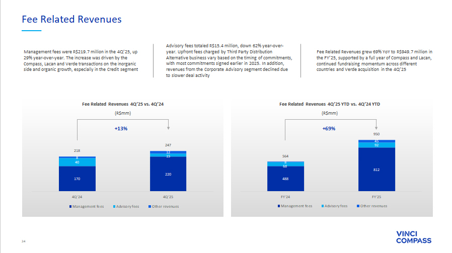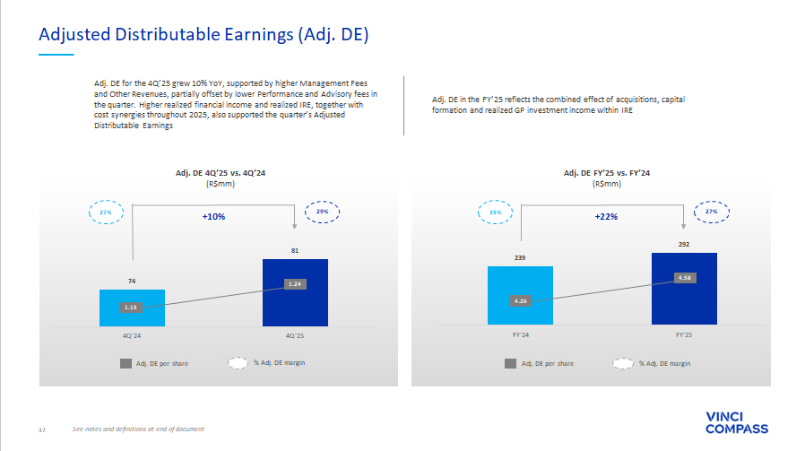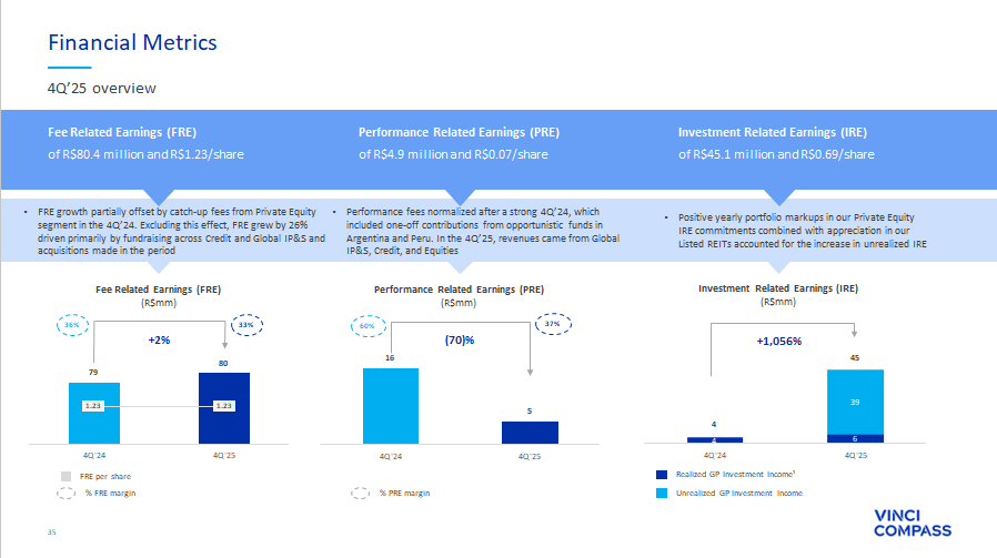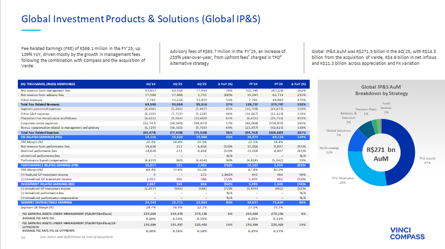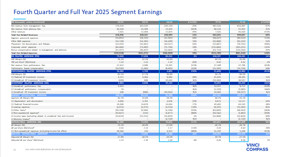 31 ∆ YoY(%) FY'25 FY'24 ∆ YoY(%) 4Q'25 3Q'25 4Q'24 (R$ thousands, unless mentioned) 67% 812,367 487,532 29% 219,730 201,539 170,193 Net revenue from management fees 35% 91,901 68,134 (62)% 15,444 25,384 40,328 Net revenue from advisory fees 473% 45,429 7,925 49% 11,819 11,404 7,925 Other revenues 69% 949,697 563,591 13% 246,993 238,327 218,446 Total Fee Related Revenues 113% (80,923) (38,027) 48% (21,981) (18,135) (14,895) Segment personnel expenses 92% (63,239) (32,868) 10% (16,200) (14,185) (14,728) Other G&A expenses 396% (78,795) (15,887) 43% (20,527) (19,461) (14,393) Placement Fee Amortization and Rebates 125% (305,015) (135,660) 18% (75,796) (73,083) (64,006) Corporate center expenses 44% (133,342) (92,753) 2% (32,064) (36,407) (31,397) Bonus compensation related to management and advisory 110% (661,316) (315,194) 19% (166,569) (161,271) (139,418) Total Fee Related Expenses 16% 288,381 248,397 2% 80,424 77,056 79,028 FEE RELATED EARNINGS (FRE) 30.4% 44.1% 32.6% 32.3% 36.2% FRE Margin (%) 2% 4.52 4.42 (0)% 1.23 1.22 1.23 FRE per share¹ (R$/share) (25)% 27,706 37,188 (51)% 13,301 2,986 27,412 Net revenue from performance fees (4)% (14,724) (15,349) (23)% (8,409) (1,282) (10,930) Performance based compensation (41)% 12,983 21,840 (70)% 4,892 1,704 16,482 PERFORMANCE RELATED EARNINGS (PRE) 46.9% 58.7% 36.8% 57.1% 60.1% PRE Margin (%) 11% 28,305 25,435 48% 6,082 4,362 4,111 (+) Realized GP investment income N/A 36,937 (10,382) N/A 39,042 686 (208) (+) Unrealized GP investment income 333% 65,242 15,053 1,056% 45,124 5,048 3,903 INVESTMENT RELATED EARNINGS (IRE) (33)% 8,711 12,937 N/A – – 9,454 ( - ) Unrealized performance fees 166% (3,083) (1,159) N/A – – 74 (+) Unrealized performance compensation N/A (36,937) 10,382 N/A (39,042) (686) 208 ( - ) Unrealized GP investment income 9% 335,297 307,451 (16)% 91,398 83,122 109,150 SEGMENT DISTRIBUTABLE EARNINGS 33.1% 48.1% 34.3% 33.8% 42.1% Segment DE Margin (%) 44% 12,517 8,672 (1)% 2,616 3,761 2,636 (+) Depreciation and amortization 28% 63,129 49,269 17% 12,024 14,878 10,308 (+) Realized financial income 85% (15,369) (8,295) 118% (4,516) (3,373) (2,072) ( - ) Leasing expenses (26)% (46,942) (63,809) (93)% (2,196) (9,984) (30,198) ( - ) Other items² (90)% (5,883) (56,562) (88)% (4,877) (133) (39,827) ( - ) Non - operational expenses³ (0)% (52,820) (52,868) 2% (14,894) (15,312) (14,610) ( - ) Income taxes (excluding related to unrealized fees and income) N/A (2,720) – N/A (2,720) – – ( - ) Minority Interest ⁴ 56% 287,209 183,857 117% 76,835 72,959 35,386 DISTRIBUTABLE EARNINGS (DE) 26.7% 26.7% 27.6% 28.0% 13.1% DE Margin (%) 34% 4.50 3.35 113% 1.17 1.15 0.55 DE per share (R$/share)⁵ (91)% 5,236 55,199 (88)% 4,453 133 38,560 (+) Non - operational expenses (including Income Tax effect) 22% 292,445 239,056 10% 81,288 73,092 73,946 ADJUSTED DISTRIBUTABLE EARNINGS⁶ 27.1% 34.7% 29.2% 28.1% 27.4% Adjusted DE Margin (%) 7% 4.58 4.26 8% 1.24 1.16 1.15 Adjusted DE per share 7 (R$/share) See notes and definitions at end of document Fourth Quarter and Full Year 2025 Segment Earnings