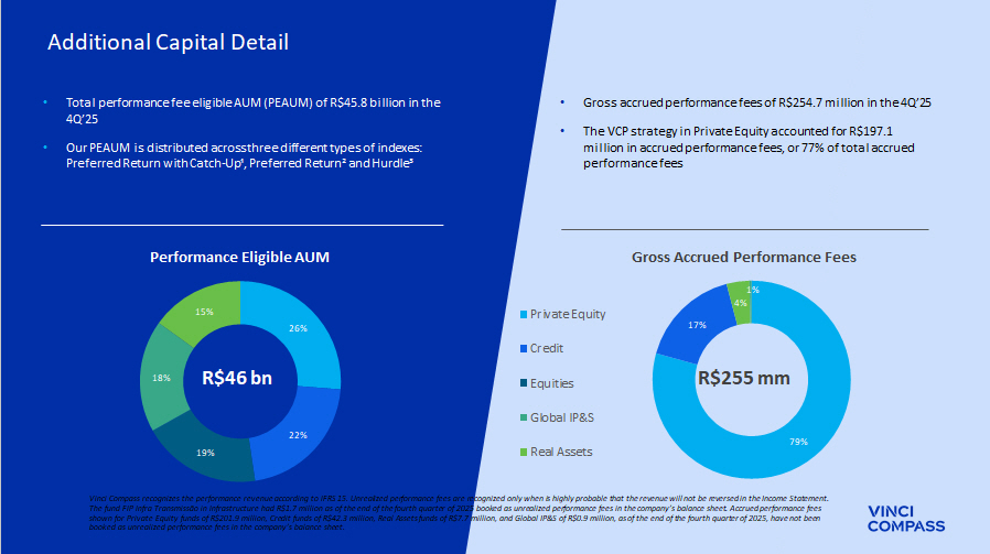 33 Vinci Compass recognizes the performance revenue according to IFRS 15. Unrealized performance fees are recognized only when i s h ighly probable that the revenue will not be reversed in the Income Statement. The fund FIP Infra Transmissão in Infrastructure had R$1.7 million as of the end of the fourth quarter of 2025 booked as unre ali zed performance fees in the company’s balance sheet. Accrued performance fees shown for Private Equity funds of R$201.9 million, Credit funds of R$42.3 million, Real Assets funds of R$7.7 million, and Gl oba l IP&S of R$0.9 million, as of the end of the fourth quarter of 2025, have not been booked as unrealized performance fees in the company’s balance sheet. Additional Capital Detail 79% 17% 4% 1% • Total performance fee eligible AUM (PEAUM) of R$45.8 billion in the 4Q’25 • Our PEAUM is distributed across three different types of indexes: Preferred Return with Catch - Up¹, Preferred Return² and Hurdle³ • Gross accrued performance fees of R$254.7 million in the 4Q’25 • The VCP strategy in Private Equity accounted for R$197.1 million in accrued performance fees, or 77% of total accrued performance fees Performance Eligible AUM R$255 mm 26% 22% 19% 18% 15% Private Equity Credit Equities Global IP&S Real Assets Gross Accrued Performance Fees R$46 bn
