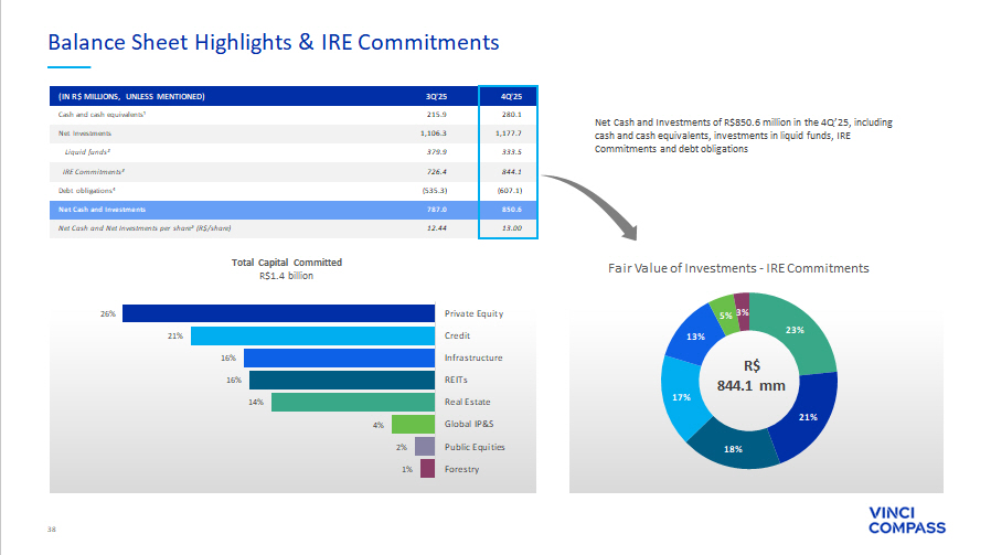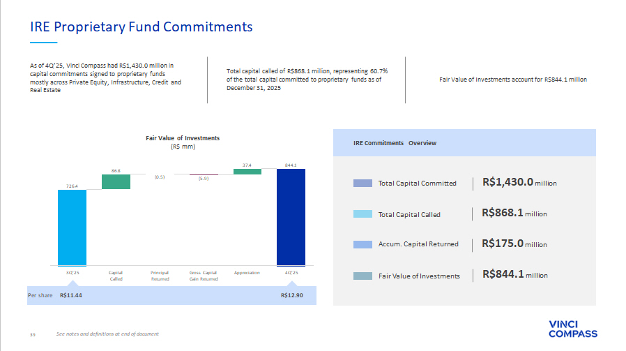 39 726.4 86.8 (0.5) (5.9) 37.4 844.1 3Q'25 Capital Called Principal Returned Gross Capital Gain Returned Appreciation 4Q'25 See notes and definitions at end of document IRE Proprietary Fund Commitments Fair Value of Investments (R$ mm) IRE Commitments Overview Per share R$12.90 R$11.44 Total Capital Committed R$1,430.0 million Total Capital Called R$868.1 million Fair Value of Investments R$844.1 million Accum. Capital Returned R$175.0 million As of 4Q’25, Vinci Compass had R$1,430.0 million in capital commitments signed to proprietary funds mostly across Private Equity, Infrastructure, Credit and Real Estate Total capital called of R$868.1 million, representing 60.7% of the total capital committed to proprietary funds as of December 31, 2025 Fair Value of Investments account for R$844.1 million