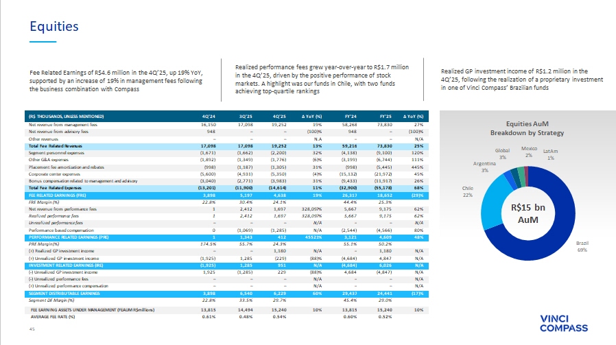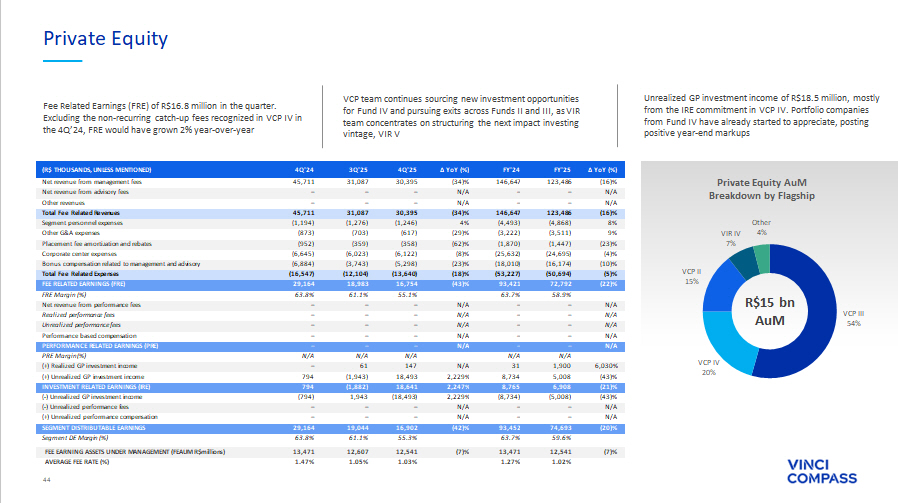 44 VCP III 54% VCP IV 20% VCP II 15% VIR IV 7% Other 4% Private Equity AuM Breakdown by Flagship Private Equity R$15 bn AuM Fee Related Earnings (FRE) of R$16.8 million in the quarter. Excluding the non - recurring catch - up fees recognized in VCP IV in the 4Q’24, FRE would have grown 2% year - over - year VCP team continues sourcing new investment opportunities for Fund IV and pursuing exits across Funds II and III, as VIR team concentrates on structuring the next impact investing vintage, VIR V ∆ YoY (%) FY'25 FY'24 ∆ YoY (%) 4Q'25 3Q'25 4Q'24 (R$ THOUSANDS, UNLESS MENTIONED) (16)% 123,486 146,647 (34)% 30,395 31,087 45,711 Net revenue from management fees N/A – – N/A – – – Net revenue from advisory fees N/A – – N/A – – – Other revenues (16)% 123,486 146,647 (34)% 30,395 31,087 45,711 Total Fee Related Revenues 8% (4,868) (4,493) 4% (1,246) (1,276) (1,194) Segment personnel expenses 9% (3,511) (3,222) (29)% (617) (703) (873) Other G&A expenses (23)% (1,447) (1,870) (62)% (358) (359) (952) Placement fee amortization and rebates (4)% (24,695) (25,632) (8)% (6,122) (6,023) (6,645) Corporate center expenses (10)% (16,174) (18,010) (23)% (5,298) (3,743) (6,884) Bonus compensation related to management and advisory (5)% (50,694) (53,227) (18)% (13,640) (12,104) (16,547) Total Fee Related Expenses (22)% 72,792 93,421 (43)% 16,754 18,983 29,164 FEE RELATED EARNINGS (FRE) 58.9% 63.7% 55.1% 61.1% 63.8% FRE Margin (%) N/A – – N/A – – – Net revenue from performance fees N/A – – N/A – – – Realized performance fees N/A – – N/A – – – Unrealized performance fees N/A – – N/A – – – Performance based compensation N/A – – N/A – – – PERFORMANCE RELATED EARNINGS (PRE) N/A N/A N/A N/A N/A PRE Margin (%) 6,030% 1,900 31 N/A 147 61 – (+) Realized GP investment income (43)% 5,008 8,734 2,229% 18,493 (1,943) 794 (+) Unrealized GP investment income (21)% 6,908 8,765 2,247% 18,641 (1,882) 794 INVESTMENT RELATED EARNINGS (IRE) (43)% (5,008) (8,734) 2,229% (18,493) 1,943 (794) ( - ) Unrealized GP investment income N/A – – N/A – – – ( - ) Unrealized performance fees N/A – – N/A – – – (+) Unrealized performance compensation (20)% 74,693 93,452 (42)% 16,902 19,044 29,164 SEGMENT DISTRIBUTABLE EARNINGS 59.6% 63.7% 55.3% 61.1% 63.8% Segment DE Margin (%) (7)% 12,541 13,471 (7)% 12,541 12,607 13,471 FEE EARNING ASSETS UNDER MANAGEMENT (FEAUM R$millions ) 1.02% 1.27% 1.03% 1.05% 1.47% AVERAGE FEE RATE (%) Unrealized GP investment income of R$18.5 million, mostly from the IRE commitment in VCP IV. Portfolio companies from Fund IV have already started to appreciate, posting positive year - end markups