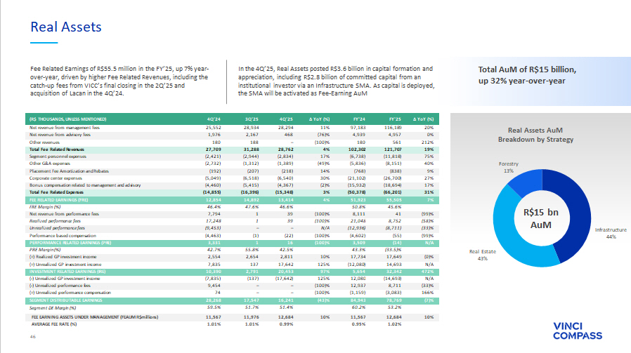 45 Brazil 69% Chile 22% Argentina 3% Global 3% Mexico 2% LatAm 1% Equities AuM Breakdown by Strategy Equities R$15 bn AuM Fee Related Earnings of R$4.6 million in the 4Q’25, up 19% YoY, supported by an increase of 19% in management fees following the business combination with Compass Realized performance fees grew year - over - year to R$1.7 million in the 4Q’25, driven by the positive performance of stock markets. A highlight was our funds in Chile, with two funds achieving top - quartile rankings ∆ YoY (%) FY'25 FY'24 ∆ YoY (%) 4Q'25 3Q'25 4Q'24 (R$ THOUSANDS, UNLESS MENTIONED) 27% 73,830 58,268 19% 19,252 17,098 16,150 Net revenue from management fees (100)% – 948 (100)% – – 948 Net revenue from advisory fees N/A – – N.A – – – Other revenues 25% 73,830 59,216 13% 19,252 17,098 17,098 Total Fee Related Revenues 120% (9,100) (4,138) 32% (2,200) (1,662) (1,671) Segment personnel expenses 111% (6,744) (3,199) (6)% (1,776) (1,349) (1,892) Other G&A expenses 445% (5,445) (998) 31% (1,305) (1,187) (998) Placement fee amortization and rebates 45% (21,972) (15,132) (4)% (5,350) (4,931) (5,600) Corporate center expenses 26% (11,917) (9,433) 31% (3,983) (2,771) (3,040) Bonus compensation related to management and advisory 68% (55,178) (32,900) 11% (14,614) (11,900) (13,201) Total Fee Related Expenses (29)% 18,652 26,317 19% 4,638 5,197 3,898 FEE RELATED EARNINGS (FRE) 25.3% 44.4% 24.1% 30.4% 22.8% FRE Margin (%) 62% 9,175 5,667 328,097% 1,697 2,412 1 Net revenue from performance fees 62% 9,175 5,667 328,097% 1,697 2,412 1 Realized performance fees N/A – – N/A – – – Unrealized performance fees 80% (4,566) (2,544) N/A (1,285) (1,069) 0 Performance based compensation 48% 4,609 3,121 45521% 412 1,343 1 PERFORMANCE RELATED EARNINGS (PRE) 50.2% 55.1% 24.3% 55.7% 174.5% PRE Margin (%) N/A 1,180 – N/A 1,180 – – (+) Realized GP investment income N/A 4,847 (4,684) (88)% (229) 1,285 (1,925) (+) Unrealized GP investment income N/A 6,026 (4,684) N/A 951 1,285 (1,925) INVESTMENT RELATED EARNINGS (IRE) N/A (4,847) 4,684 (88)% 229 (1,285) 1,925 ( - ) Unrealized GP investment income N/A – – N/A – – – ( - ) Unrealized performance fees N/A – – N/A – – – (+) Unrealized performance compensation (17)% 24,441 29,437 60% 6,229 6,540 3,898 SEGMENT DISTRIBUTABLE EARNINGS 29.0% 45.4% 29.7% 33.5% 22.8% Segment DE Margin (%) 10% 15,240 13,815 10% 15,240 14,494 13,815 FEE EARNING ASSETS UNDER MANAGEMENT (FEAUM R$millions ) 0.52% 0.60% 0.54% 0.48% 0.61% AVERAGE FEE RATE (%) Realized GP investment income of R$1.2 million in the 4Q’25, following the realization of a proprietary investment in one of Vinci Compass’ Brazilian funds