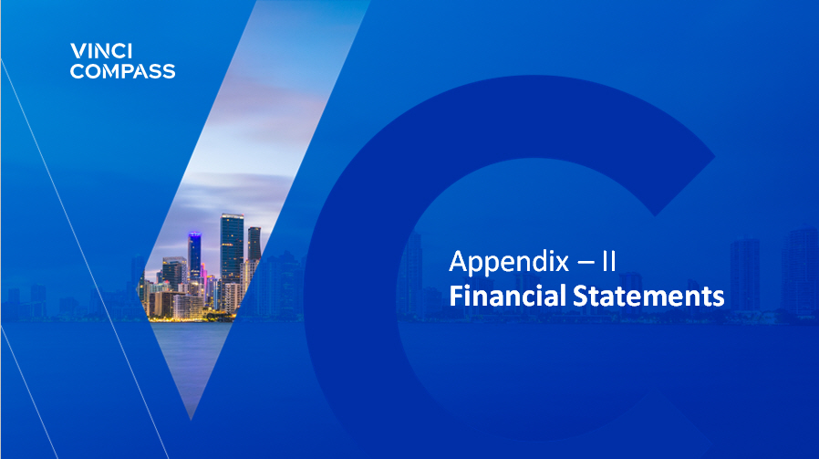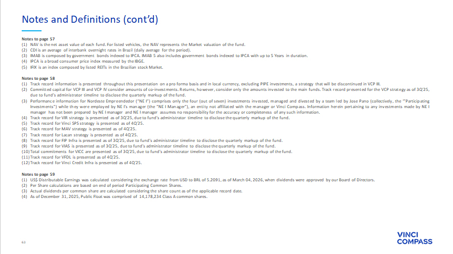 63 Notes to page 57 (1) NAV is the net asset value of each fund . For listed vehicles, the NAV represents the Market valuation of the fund . (2) CDI is an average of interbank overnight rates in Brazil (daily average for the period) . (3) IMAB is composed by government bonds indexed to IPCA . IMAB 5 also includes government bonds indexed to IPCA with up to 5 Years in duration . (4) IPCA is a broad consumer price index measured by the IBGE . (5) IFIX is an index composed by listed REITs in the Brazilian stock Market . Notes to page 58 (1) Track record information is presented throughout this presentation on a pro forma basis and in local currency, excluding PIPE investments, a strategy that will be discontinued in VCP III . (2) Committed capital for VCP III and VCP IV consider amounts of co - investments . Returns, however, consider only the amounts invested to the main funds . Track record presented for the VCP strategy as of 3 Q’ 25 , due to fund’s administrator timeline to disclose the quarterly markup of the fund . (3) Performance information for Nordeste Empreendedor (“NE I”) comprises only the four (out of seven) investments invested, managed and divested by a team led by Jose Pano (collectively, the ‘”Participating Investments”) while they were employed by NE I’s manager (the “NE I Manager”), an entity not affiliated with the manager or Vinci Compass . Information herein pertaining to any investments made by NE I manager has not been prepared by NE I manager and NE I manager assumes no responsibility for the accuracy or completeness of any such information . (4) Track record for VIR strategy is presented as of 3 Q’ 25 , due to fund’s administrator timeline to disclose the quarterly markup of the fund . (5) Track record for Vinci SPS strategy is presented as of 4 Q’ 25 . (6) Track record for MAV strategy is presented as of 4 Q’ 25 . (7) Track record for Lacan strategy is presented as of 4 Q’ 25 . (8) Track record for FIP Infra is presented as of 3 Q’ 25 , due to fund’s administrator timeline to disclose the quarterly markup of the fund . (9) Track record for VIAS is presented as of 3 Q’ 25 , due to fund’s administrator timeline to disclose the quarterly markup of the fund . (10) Total commitments for VICC are presented as of 3 Q’ 25 , due to fund’s administrator timeline to disclose the quarterly markup of the fund . (11) Track record for VFDL is presented as of 4 Q’ 25 . (12) Track record for Vinci Credit Infra is presented as of 4 Q’ 25 . Notes to page 59 (1) US $ Distributable Earnings was calculated considering the exchange rate from USD to BRL of 5 . 2091 , as of March 04 , 2026 , when dividends were approved by our Board of Directors . (2) Per Share calculations are based on end of period Participating Common Shares . (3) Actual dividends per common share are calculated considering the share count as of the applicable record date . (4) As of December 31 , 2025 , Public Float was comprised of 14 , 178 , 234 Class A common shares . Notes and Definitions (cont’d)