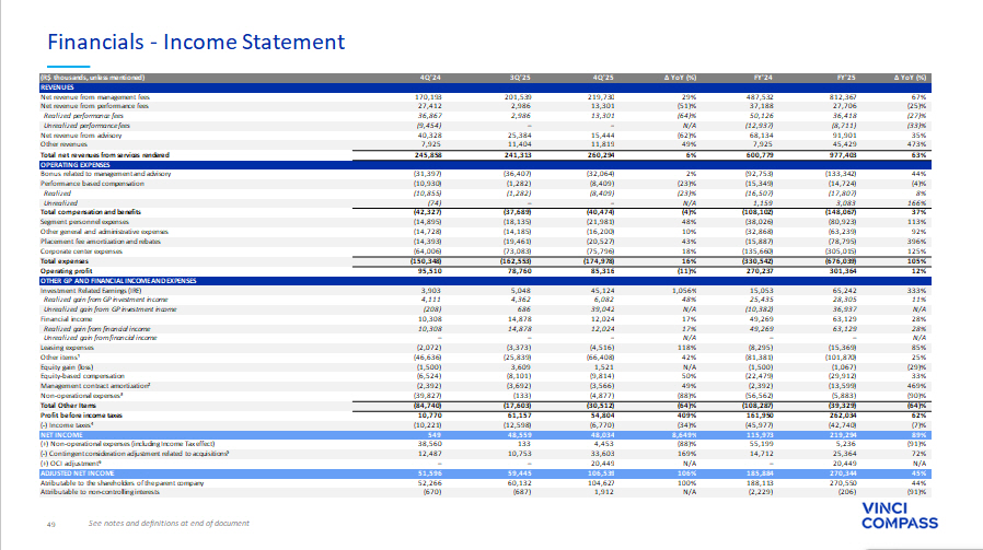 49 Financials - Income Statement ∆ YoY (%) FY'25 FY'24 ∆ YoY (%) 4Q'25 3Q'25 4Q'24 (R$ thousands, unless mentioned) REVENUES 67% 812,367 487,532 29% 219,730 201,539 170,193 Net revenue from management fees (25)% 27,706 37,188 (51)% 13,301 2,986 27,412 Net revenue from performance fees (27)% 36,418 50,126 (64)% 13,301 2,986 36,867 Realized performance fees (33)% (8,711) (12,937) N/A – – (9,454) Unrealized performance fees 35% 91,901 68,134 (62)% 15,444 25,384 40,328 Net revenue from advisory 473% 45,429 7,925 49% 11,819 11,404 7,925 Other revenues 63% 977,403 600,779 6% 260,294 241,313 245,858 Total net revenues from services rendered OPERATING EXPENSES 44% (133,342) (92,753) 2% (32,064) (36,407) (31,397) Bonus related to management and advisory (4)% (14,724) (15,349) (23)% (8,409) (1,282) (10,930) Performance based compensation 8% (17,807) (16,507) (23)% (8,409) (1,282) (10,855) Realized 166% 3,083 1,159 N/A – – (74) Unrealized 37% (148,067) (108,102) (4)% (40,474) (37,689) (42,327) Total compensation and benefits 113% (80,923) (38,026) 48% (21,981) (18,135) (14,895) Segment personnel expenses 92% (63,239) (32,868) 10% (16,200) (14,185) (14,728) Other general and administrative expenses 396% (78,795) (15,887) 43% (20,527) (19,461) (14,393) Placement fee amortization and rebates 125% (305,015) (135,660) 18% (75,796) (73,083) (64,006) Corporate center expenses 105% (676,039) (330,542) 16% (174,978) (162,553) (150,348) Total expenses 12% 301,364 270,237 (11)% 85,316 78,760 95,510 Operating profit OTHER GP AND FINANCIAL INCOME AND EXPENSES 333% 65,242 15,053 1,056% 45,124 5,048 3,903 Investment Related Earnings (IRE) 11% 28,305 25,435 48% 6,082 4,362 4,111 Realized gain from GP investment income N/A 36,937 (10,382) N/A 39,042 686 (208) Unrealized gain from GP investment income 28% 63,129 49,269 17% 12,024 14,878 10,308 Financial income 28% 63,129 49,269 17% 12,024 14,878 10,308 Realized gain from financial income N/A – – N/A – – – Unrealized gain from financial income 85% (15,369) (8,295) 118% (4,516) (3,373) (2,072) Leasing expenses 25% (101,870) (81,381) 42% (66,408) (25,839) (46,636) Other items¹ (29)% (1,067) (1,500) N/A 1,521 3,609 (1,500) Equity gain (loss) 33% (29,912) (22,479) 50% (9,814) (8,101) (6,524) Equity - based compensation 469% (13,599) (2,392) 49% (3,566) (3,692) (2,392) Management contract amortization² (90)% (5,883) (56,562) (88)% (4,877) (133) (39,827) Non - operational expenses³ (64)% (39,329) (108,287) (64)% (30,512) (17,603) (84,740) Total Other Items 62% 262,034 161,950 409% 54,804 61,157 10,770 Profit before income taxes (7)% (42,740) (45,977) (34)% (6,770) (12,598) (10,221) ( - ) Income taxes⁴ 89% 219,294 115,973 8,649% 48,034 48,559 549 NET INCOME (91)% 5,236 55,199 (88)% 4,453 133 38,560 (+) Non - operational expenses (including Income Tax effect) 72% 25,364 14,712 169% 33,603 10,753 12,487 ( - ) Contingent consideration adjustment related to acquisitions⁵ N/A 20,449 – N/A 20,449 – – (+) OCI adjustment⁶ 45% 270,344 185,884 106% 106,539 59,445 51,596 ADJUSTED NET INCOME 44% 270,550 188,113 100% 104,627 60,132 52,266 Atributable to the shareholders of the parent company (91)% (206) (2,229) N/A 1,912 (687) (670) Attributable to non - controlling interests See notes and definitions at end of document