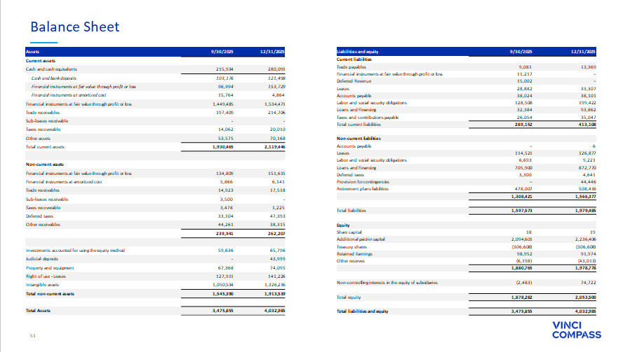 51 Balance Sheet 12/31/2025 9/30/2025 Assets Current assets 280,091 215,934 Cash and cash equivalents 121,498 103,176 Cash and bank deposits 153,729 96,994 Financial instruments at fair value through profit or loss 4,864 15,764 Financial instruments at amortized cost 1,534,471 1,449,485 Financial instruments at fair value through profit or loss 214,706 197,409 Trade receivables - - Sub - leases receivable 20,010 14,062 Taxes recoverable 70,168 53,575 Other assets 2,119,446 1,930,465 Total current assets Non - current assets 151,615 134,809 Financial instruments at fair value through profit or loss 6,141 5,866 Financial instruments at amortized cost 17,518 14,923 Trade receivables - 3,500 Sub - leases receivable 1,225 3,478 Taxes recoverable 47,393 33,104 Deferred taxes 38,315 44,261 Other receivables 262,207 239,941 65,796 59,636 Investments accounted for using the equity method 43,999 - Judicial deposits 74,095 67,368 Property and equipment 141,226 127,911 Right of use - Leases 1,326,216 1,050,534 Intangible assets 1,913,539 1,545,390 Total non - current assets 4,032,985 3,475,855 Total Assets 12/31/2025 9/30/2025 Liabilities and equity Current liabilities 13,369 9,081 Trade payables – 11,217 Financial instruments at fair value through profit or loss – 15,002 Deferred Revenue 33,307 28,882 Leases 38,101 38,024 Accounts payable 199,422 128,508 Labor and social security obligations 93,862 32,384 Loans and Financing 35,047 26,054 Taxes and contributions payable 413,108 289,152 Total current liabilities Non - current liabilities 6 – Accounts payable 126,877 114,521 Leases 9,221 6,693 Labor and social security obligations 872,770 705,900 Loans and Financing 4,641 3,300 Deferred taxes 44,446 – Provision for contingencies 508,416 478,007 Retirement plans liabilities 1,566,377 1,308,421 1,979,485 1,597,573 Total liabilities Equity 19 18 Share capital 2,236,406 2,094,601 Additional paid - in capital (306,608) (306,608) Treasury shares 91,974 98,952 Retained Earnings (43,013) (6,198) Other reserves 1,978,778 1,880,765 74,722 (2,483) Non - controlling interests in the equity of subsidiaries 2,053,500 1,878,282 Total equity 4,032,985 3,475,855 Total liabilities and equity
