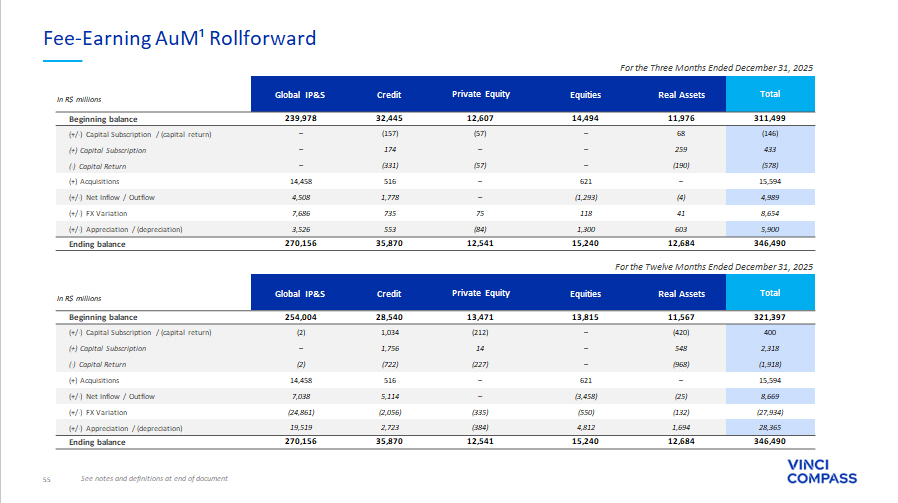 54 See notes and definitions at end of document AuM¹ Rollforward Total Real Assets Equities Private Equity Credit Global IP&S In R$ millions 316,259 12,071 14,542 15,548 32,882 241,217 Beginning balance 2,528 2,742 – (57) (157) – (+/ - ) Capital Subscription / (capital return) 3,106 2,932 – – 174 – (+) Capital Subscription (578) (190) – (57) (331) – ( - ) Capital Return 15,594 – 621 – 516 14,458 (+) Acquisitions 5,309 (4) (1,295) – 2,049 4,559 (+/ - ) Net Inflow / Outflow 8,688 41 118 75 748 7,706 (+/ - ) FX Variation 5,731 626 1,301 (175) 428 3,552 (+/ - ) Appreciation / (depreciation) 354,108 15,476 15,286 15,390 36,464 271,492 Ending balance For the Three Months Ended December 31, 2025 Total Real Assets Equities Private Equity Credit Global IP&S In R$ millions 326,961 11,702 13,883 16,760 29,213 255,403 Beginning balance 3,036 2,224 – (231) 1,044 (2) (+/ - ) Capital Subscription / (capital return) 5,003 3,221 – 16 1,766 0 (+) Capital Subscription (1,968) (997) – (247) (722) (2) ( - ) Capital Return 15,594 – 621 – 516 14,458 (+) Acquisitions 8,911 (25) (3,496) – 5,338 7,094 (+/ - ) Net Inflow / Outflow (28,047) (132) (554) (335) (2,106) (24,920) (+/ - ) FX Variation 27,653 1,706 4,833 (805) 2,460 19,459 (+/ - ) Appreciation / (depreciation) 354,108 15,476 15,286 15,390 36,464 271,492 Ending balance For the Twelve Months Ended December 31, 2025