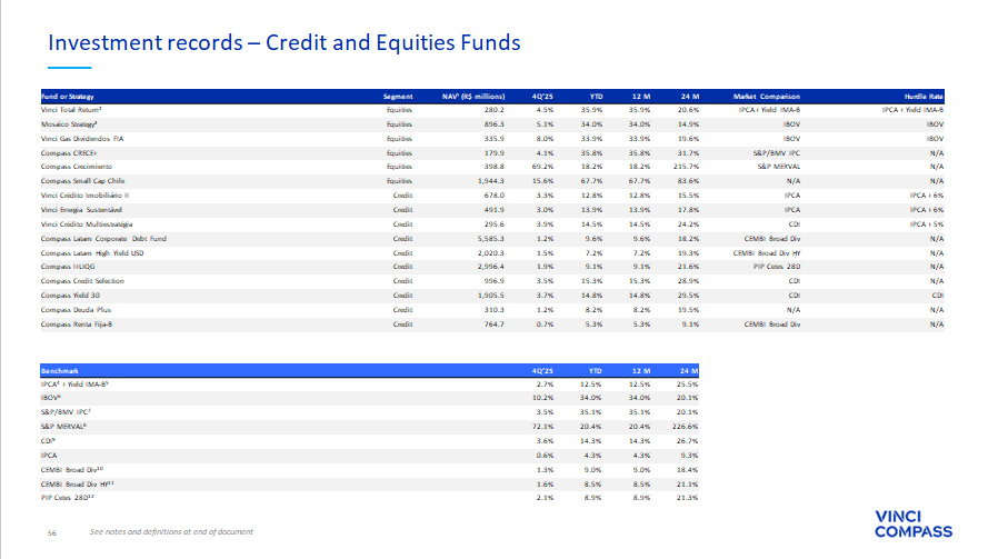 56 Investment records – Credit and Equities Funds Hurdle Rate Market Comparison 24 M 12 M YTD 4Q’25 NAV¹ (R$ millions) Segment Fund or Strategy IPCA + Yield IMA - B IPCA + Yield IMA - B 20.6% 35.9% 35.9% 4.5% 280.2 Equities Vinci Total Return² IBOV IBOV 14.9% 34.0% 34.0% 5.1% 896.3 Equities Mosaico Strategy³ IBOV IBOV 19.6% 33.9% 33.9% 8.0% 335.9 Equities Vinci Gas Dividendos FIA N/A S&P/BMV IPC 31.7% 35.8% 35.8% 4.1% 179.9 Equities Compass CRECE+ N/A S&P MERVAL 215.7% 18.2% 18.2% 69.2% 398.8 Equities Compass Crecimiento N/A N/A 83.6% 67.7% 67.7% 15.6% 1,944.3 Equities Compass Small Cap Chile IPCA + 6% IPCA 15.5% 12.8% 12.8% 3.3% 678.0 Credit Vinci Crédito Imobiliário II IPCA + 6% IPCA 17.8% 13.9% 13.9% 3.0% 491.9 Credit Vinci Energia Sustentável IPCA + 5% CDI 24.2% 14.5% 14.5% 3.9% 295.6 Credit Vinci Crédito Multiestratégia N/A CEMBI Broad Div 18.2% 9.6% 9.6% 1.2% 5,585.3 Credit Compass Latam Corporate Debt Fund N/A CEMBI Broad Div HY 19.3% 7.2% 7.2% 1.5% 2,020.3 Credit Compass Latam High Yield USD N/A PIP Cetes 28D 21.6% 9.1% 9.1% 1.9% 2,996.4 Credit Compass I+LIQG N/A CDI 28.9% 15.3% 15.3% 3.5% 996.9 Credit Compass Credit Selection CDI CDI 29.5% 14.8% 14.8% 3.7% 1,905.5 Credit Compass Yield 30 N/A N/A 19.5% 8.2% 8.2% 1.2% 310.3 Credit Compass Deuda Plus N/A CEMBI Broad Div 9.1% 5.3% 5.3% 0.7% 764.7 Credit Compass Renta Fija - B See notes and definitions at end of document 24 M 12 M YTD 4Q’25 Benchmark 25.5% 12.5% 12.5% 2.7% IPCA 4 + Yield IMA - B 5 20.1% 34.0% 34.0% 10.2% IBOV 6 20.1% 35.1% 35.1% 3.5% S&P/BMV IPC 7 226.6% 20.4% 20.4% 72.1% S&P MERVAL 8 26.7% 14.3% 14.3% 3.6% CDI 9 9.3% 4.3% 4.3% 0.6% IPCA 18.4% 9.0% 9.0% 1.3% CEMBI Broad Div 10 21.1% 8.5% 8.5% 1.6% CEMBI Broad Div HY 11 21.3% 8.9% 8.9% 2.1% PIP Cetes 28D 12