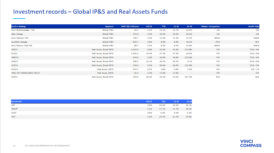 57 Investment records – Global IP&S and Real Assets Funds See notes and definitions at end of document 24 M 12 M YTD 4Q’25 Benchmark 26.7% 14.3% 14.3% 3.6% CDI 2 18.5% 11.7% 11.7% 3.1% IMA - B 3 9.3% 4.3% 4.3% 0.6% IPCA 4 14.0% 21.1% 21.1% 5.2% IFIX 5 Hurdle Rate Market Comparison 24 M 12 M YTD 4Q’25 NAV¹ (R$ millions) Segment Fund or Strategy CDI CDI 22.4% 12.7% 12.7% 3.3% 43.5 Global IP&S Vinci Multiestratégia FIM CDI CDI 20.3% 10.4% 10.4% 2.9% 154.0 Global IP&S Atlas Strategy IMA - B IMA - B 19.7% 11.3% 11.3% 3.2% 736.7 Global IP&S Vinci Valorem FIM N/A IPCA 16.2% 8.8% 8.8% 2.8% 649.7 Global IP&S Equilibrio Strategy IMA - B IMA - B 15.8% 8.2% 8.2% 3.2% 88.7 Global IP&S Vinci Retorno Real FIM IPCA + 6% IFIX (11.8)% 23.4% 23.4% 0.8% 3,143.5 Real Assets (listed REIT) VISC11 IPCA + 6% IFIX 20.4% 47.3% 47.3% 14.9% 1,492.2 Real Assets (listed REIT) VILG11 IPCA + 6% IFIX (15.6)% 16.8% 16.8% 3.0% 418.2 Real Assets (listed REIT) VINO11 IPCA + 6% IFIX 0.7% 20.1% 20.1% 12.7% 166.5 Real Assets (listed REIT) VIUR11 IPCA + X% IFIX (12.3)% 26.8% 26.8% 4.9% 128.3 Real Assets (listed REIT) VCRI11 CDI + 1% IFIX 5.0% 3.8% 3.8% 0.5% 393.7 Real Assets (REIT) VICA11 IFIX IFIX - 17.8% 17.8% 5.3% 45.3 Real Assets (REIT) VINCI FOF IMOBILIARIO FIM CP N/A N/A (41.7)% 54.4% 54.4% 20.3% 390.4 Real Assets (listed REIT) VIGT11