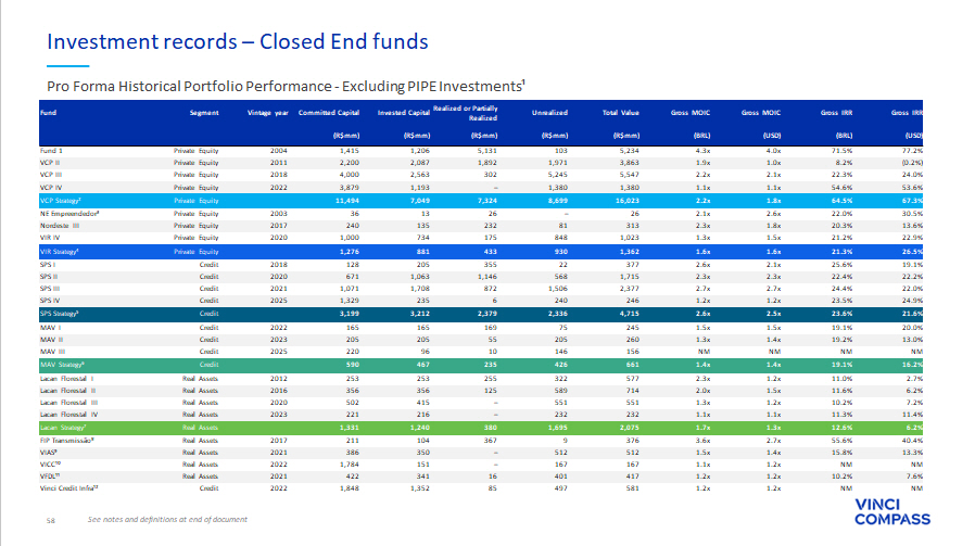 58 See notes and definitions at end of document Investment records – Closed End funds Pro Forma Historical Portfolio Performance - Excluding PIPE Investments¹ Gross IRR Gross IRR Gross MOIC Gross MOIC Total Value Unrealized Realized or Partially Realized Invested Capital Committed Capital Vintage year Segment Fund (USD) (BRL) (USD) (BRL) (R$mm) (R$mm) (R$mm) (R$mm) (R$mm) 77.2% 71.5% 4.0x 4.3x 5,234 103 5,131 1,206 1,415 2004 Private Equity Fund 1 (0.2%) 8.2% 1.0x 1.9x 3,863 1,971 1,892 2,087 2,200 2011 Private Equity VCP II 24.0% 22.3% 2.1x 2.2x 5,547 5,245 302 2,563 4,000 2018 Private Equity VCP III 53.6% 54.6% 1.1x 1.1x 1,380 1,380 – 1,193 3,879 2022 Private Equity VCP IV 67.3% 64.5% 1.8x 2.2x 16,023 8,699 7,324 7,049 11,494 Private Equity VCP Strategy² 30.5% 22.0% 2.6x 2.1x 26 – 26 13 36 2003 Private Equity NE Empreendedor³ 13.6% 20.3% 1.8x 2.3x 313 81 232 135 240 2017 Private Equity Nordeste III 22.9% 21.2% 1.5x 1.3x 1,023 848 175 734 1,000 2020 Private Equity VIR IV 26.5% 21.3% 1.6x 1.6x 1,362 930 433 881 1,276 Private Equity VIR Strategy⁴ 19.1% 25.6% 2.1x 2.6x 377 22 355 205 128 2018 Credit SPS I 22.2% 22.4% 2.3x 2.3x 1,715 568 1,146 1,063 671 2020 Credit SPS II 22.0% 24.4% 2.7x 2.7x 2,377 1,506 872 1,708 1,071 2021 Credit SPS III 24.9% 23.5% 1.2x 1.2x 246 240 6 235 1,329 2025 Credit SPS IV 21.6% 23.6% 2.5x 2.6x 4,715 2,336 2,379 3,212 3,199 Credit SPS Strategy⁵ 20.0% 19.1% 1.5x 1.5x 245 75 169 165 165 2022 Credit MAV I 13.0% 19.2% 1.4x 1.3x 260 205 55 205 205 2023 Credit MAV II NM NM NM NM 156 146 10 96 220 2025 Credit MAV III 16.2% 19.1% 1.4x 1.4x 661 426 235 467 590 Credit MAV Strategy⁶ 2.7% 11.0% 1.2x 2.3x 577 322 255 253 253 2012 Real Assets Lacan Florestal I 6.2% 11.6% 1.5x 2.0x 714 589 125 356 356 2016 Real Assets Lacan Florestal II 7.2% 10.2% 1.2x 1.3x 551 551 – 415 502 2020 Real Assets Lacan Florestal III 11.4% 11.3% 1.1x 1.1x 232 232 – 216 221 2023 Real Assets Lacan Florestal IV 6.2% 12.6% 1.3x 1.7x 2,075 1,695 380 1,240 1,331 Real Assets Lacan Strategy⁷ 40.4% 55.6% 2.7x 3.6x 376 9 367 104 211 2017 Real Assets FIP Transmissão⁸ 13.3% 15.8% 1.4x 1.5x 512 512 – 350 386 2021 Real Assets VIAS⁹ NM NM 1.2x 1.1x 167 167 – 151 1,784 2022 Real Assets VICC¹⁰ 7.6% 10.2% 1.2x 1.2x 417 401 16 341 422 2021 Real Assets VFDL¹¹ NM NM 1.2x 1.2x 581 497 85 1,352 1,848 2022 Credit Vinci Credit Infra¹²