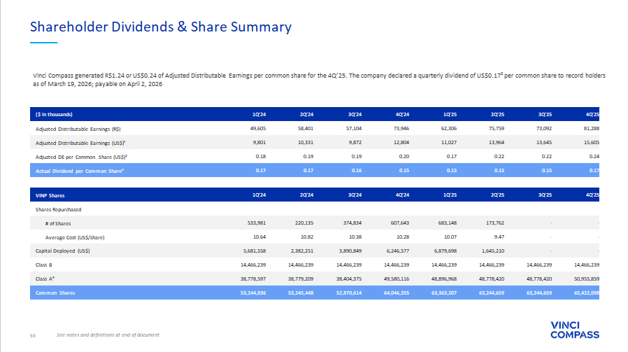 59 See notes and definitions at end of document Shareholder Dividends & Share Summary 4Q'25 3Q'25 2Q'25 1Q'25 4Q'24 3Q'24 2Q'24 1Q'24 ($ in thousands) 81,288 73,092 75,759 62,306 73,946 57,104 58,401 49,605 Adjusted Distributable Earnings (R$) 15,605 13,645 13,964 11,027 12,804 9,872 10,331 9,801 Adjusted Distributable Earnings (US$)¹ 0.24 0.22 0.22 0.17 0.20 0.19 0.19 0.18 Adjusted DE per Common Share (US$)² 0.17 0.15 0.15 0.15 0.15 0.16 0.17 0.17 Actual Dividend per Common Share³ 4Q'25 3Q'25 2Q'25 1Q'25 4Q'24 3Q'24 2Q'24 1Q'24 VINP Shares Shares Repurchased - - 173,762 683,148 607,643 374,834 220,135 533,981 # of Shares - - 9.47 10.07 10.28 10.38 10.82 10.64 Average Cost (US$/share) - - 1,645,210 6,879,698 6,246,577 3,890,849 2,382,251 5,681,558 Capital Deployed (US$) 14,466,239 14,466,239 14,466,239 14,466,239 14,466,239 14,466,239 14,466,239 14,466,239 Class B 50,955,859 48,778,420 48,778,420 48,896,968 49,580,116 38,404,375 38,779,209 38,778,597 Class A⁴ 65,422,098 63,244,659 63,244,659 63,363,207 64,046,355 52,870,614 53,245,448 53,244,836 Common Shares Vinci Compass generated R$1.24 or US$0.24 of Adjusted Distributable Earnings per common share for the 4Q’25. The company decl are d a quarterly dividend of US$0.17² per common share to record holders as of March 19, 2026; payable on April 2, 2026