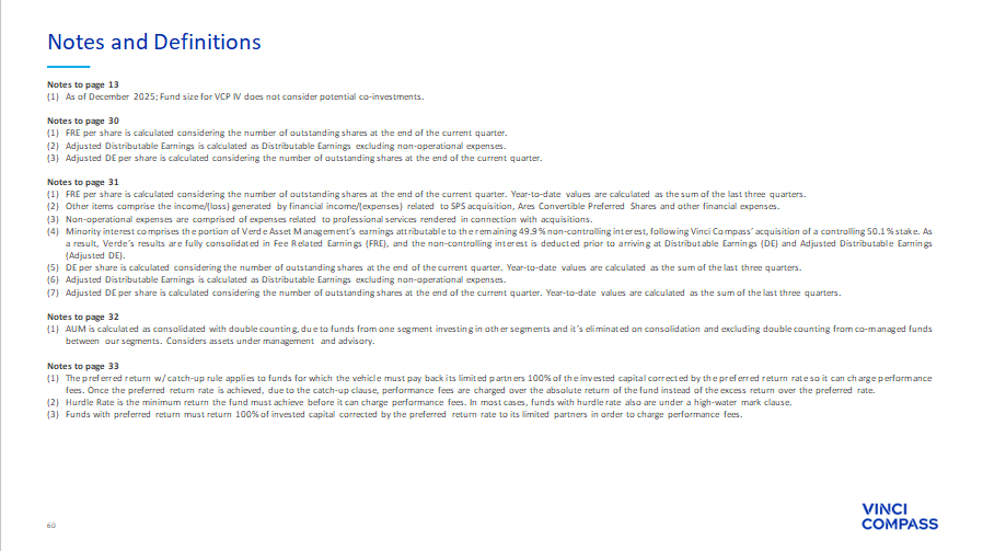 60 Notes to page 13 (1) As of December 2025 ; Fund size for VCP IV does not consider potential co - investments . Notes to page 30 (1) FRE per share is calculated considering the number of outstanding shares at the end of the current quarter . (2) Adjusted Distributable Earnings is calculated as Distributable Earnings excluding non - operational expenses . (3) Adjusted DE per share is calculated considering the number of outstanding shares at the end of the current quarter . Notes to page 31 (1) FRE per share is calculated considering the number of outstanding shares at the end of the current quarter . Year - to - date values are calculated as the sum of the last three quarters . (2) Other items comprise the income/(loss) generated by financial income/(expenses) related to SPS acquisition, Ares Convertible Preferred Shares and other financial expenses . (3) Non - operational expenses are comprised of expenses related to professional services rendered in connection with acquisitions . (4) Minority interest comprises the portion of Verde Asset Management’s earnings attributable to the remaining 49 . 9 % non - controlling interest, following Vinci Compass’ acquisition of a controlling 50 . 1 % stake . As a result, Verde’s results are fully consolidated in Fee Related Earnings (FRE), and the non - controlling interest is deducted prior to arriving at Distributable Earnings (DE) and Adjusted Distributable Earnings (Adjusted DE) . (5) DE per share is calculated considering the number of outstanding shares at the end of the current quarter . Year - to - date values are calculated as the sum of the last three quarters . (6) Adjusted Distributable Earnings is calculated as Distributable Earnings excluding non - operational expenses . (7) Adjusted DE per share is calculated considering the number of outstanding shares at the end of the current quarter . Year - to - date values are calculated as the sum of the last three quarters . Notes to page 32 (1) AUM is calculated as consolidated with double counting, due to funds from one segment investing in other segments and it’s eliminated on consolidation and excluding double counting from co - managed funds between our segments . Considers assets under management and advisory . Notes to page 33 (1) The preferred return w/ catch - up rule applies to funds for which the vehicle must pay back its limited partners 100 % of the invested capital corrected by the preferred return rate so it can charge performance fees . Once the preferred return rate is achieved, due to the catch - up clause, performance fees are charged over the absolute return of the fund instead of the excess return over the preferred rate . (2) Hurdle Rate is the minimum return the fund must achieve before it can charge performance fees . In most cases, funds with hurdle rate also are under a high - water mark clause . (3) Funds with preferred return must return 100 % of invested capital corrected by the preferred return rate to its limited partners in order to charge performance fees . Notes and Definitions