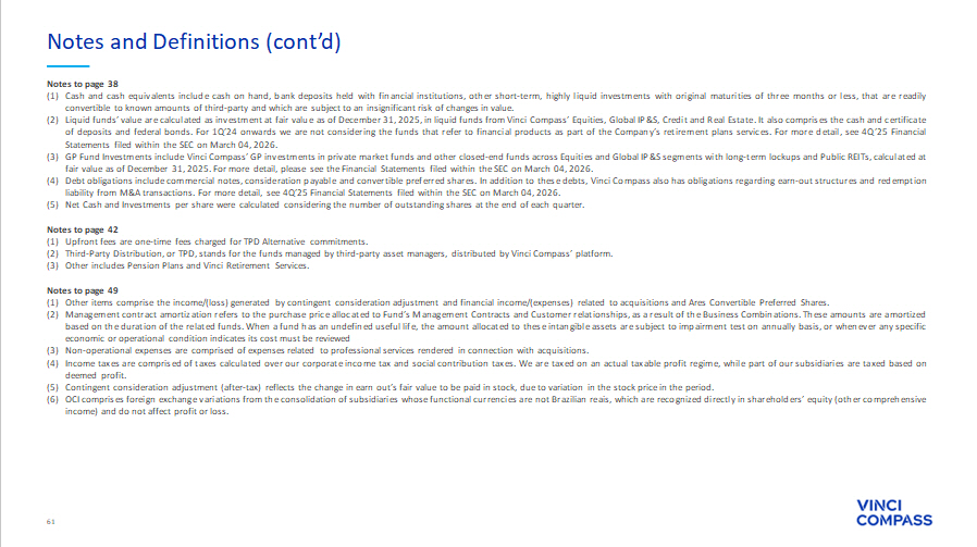 61 Notes to page 38 (1) Cash and cash equivalents include cash on hand, bank deposits held with financial institutions, other short - term, highly liquid investments with original maturities of three months or less, that are readily convertible to known amounts of third - party and which are subject to an insignificant risk of changes in value . (2) Liquid funds’ value are calculated as investment at fair value as of December 31 , 2025 , in liquid funds from Vinci Compass’ Equities, Global IP&S, Credit and Real Estate . It also comprises the cash and certificate of deposits and federal bonds . For 1 Q’ 24 onwards we are not considering the funds that refer to financial products as part of the Company’s retirement plans services . For more detail, see 4 Q’ 25 Financial Statements filed within the SEC on March 04 , 2026 . (3) GP Fund Investments include Vinci Compass’ GP investments in private market funds and other closed - end funds across Equities and Global IP&S segments with long - term lockups and Public REITs, calculated at fair value as of December 31 , 2025 . For more detail, please see the Financial Statements filed within the SEC on March 04 , 2026 . (4) Debt obligations include commercial notes, consideration payable and convertible preferred shares . In addition to these debts, Vinci Compass also has obligations regarding earn - out structures and redemption liability from M&A transactions . For more detail, see 4 Q’ 25 Financial Statements filed within the SEC on March 04 , 2026 . (5) Net Cash and Investments per share were calculated considering the number of outstanding shares at the end of each quarter . Notes to page 42 (1) Upfront fees are one - time fees charged for TPD Alternative commitments . (2) Third - Party Distribution, or TPD, stands for the funds managed by third - party asset managers, distributed by Vinci Compass’ platform . (3) Other includes Pension Plans and Vinci Retirement Services . Notes to page 49 (1) Other items comprise the income/(loss) generated by contingent consideration adjustment and financial income/(expenses) related to acquisitions and Ares Convertible Preferred Shares . (2) Management contract amortization refers to the purchase price allocated to Fund’s Management Contracts and Customer relationships, as a result of the Business Combinations . These amounts are amortized based on the duration of the related funds . When a fund has an undefined useful life, the amount allocated to these intangible assets are subject to impairment test on annually basis, or whenever any specific economic or operational condition indicates its cost must be reviewed (3) Non - operational expenses are comprised of expenses related to professional services rendered in connection with acquisitions . (4) Income taxes are comprised of taxes calculated over our corporate income tax and social contribution taxes . We are taxed on an actual taxable profit regime, while part of our subsidiaries are taxed based on deemed profit . (5) Contingent consideration adjustment (after - tax) reflects the change in earn out’s fair value to be paid in stock, due to variation in the stock price in the period . (6) OCI comprises foreign exchange variations from the consolidation of subsidiaries whose functional currencies are not Brazilian reais, which are recognized directly in shareholders’ equity (other comprehensive income) and do not affect profit or loss . Notes and Definitions (cont’d)