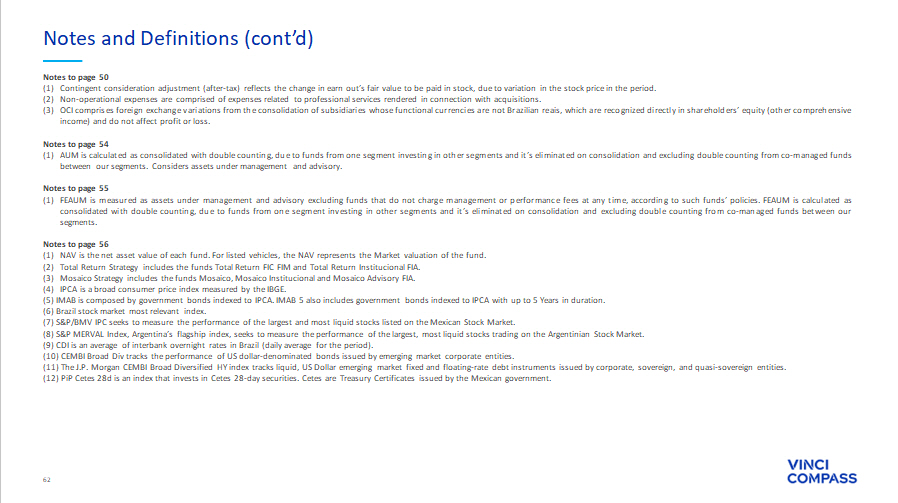 62 Notes to page 50 (1) Contingent consideration adjustment (after - tax) reflects the change in earn out’s fair value to be paid in stock, due to variation in the stock price in the period . (2) Non - operational expenses are comprised of expenses related to professional services rendered in connection with acquisitions . (3) OCI comprises foreign exchange variations from the consolidation of subsidiaries whose functional currencies are not Brazilian reais, which are recognized directly in shareholders’ equity (other comprehensive income) and do not affect profit or loss . Notes to page 54 (1) AUM is calculated as consolidated with double counting, due to funds from one segment investing in other segments and it’s eliminated on consolidation and excluding double counting from co - managed funds between our segments . Considers assets under management and advisory . Notes to page 55 (1) FEAUM is measured as assets under management and advisory excluding funds that do not charge management or performance fees at any time, according to such funds’ policies . FEAUM is calculated as consolidated with double counting, due to funds from one segment investing in other segments and it’s eliminated on consolidation and excluding double counting from co - managed funds between our segments . Notes to page 56 (1) NAV is the net asset value of each fund . For listed vehicles, the NAV represents the Market valuation of the fund . (2) Total Return Strategy includes the funds Total Return FIC FIM and Total Return Institucional FIA . (3) Mosaico Strategy includes the funds Mosaico, Mosaico Institucional and Mosaico Advisory FIA . (4) IPCA is a broad consumer price index measured by the IBGE . ( 5 ) IMAB is composed by government bonds indexed to IPCA . IMAB 5 also includes government bonds indexed to IPCA with up to 5 Years in duration . ( 6 ) Brazil stock market most relevant index . ( 7 ) S&P/BMV IPC seeks to measure the performance of the largest and most liquid stocks listed on the Mexican Stock Market . ( 8 ) S&P MERVAL Index, Argentina’s flagship index, seeks to measure the performance of the largest, most liquid stocks trading on the Argentinian Stock Market . ( 9 ) CDI is an average of interbank overnight rates in Brazil (daily average for the period) . ( 10 ) CEMBI Broad Div tracks the performance of US dollar - denominated bonds issued by emerging market corporate entities . ( 11 ) The J . P . Morgan CEMBI Broad Diversified HY index tracks liquid, US Dollar emerging market fixed and floating - rate debt instruments issued by corporate, sovereign, and quasi - sovereign entities . ( 12 ) PiP Cetes 28 d is an index that invests in Cetes 28 - day securities . Cetes are Treasury Certificates issued by the Mexican government . Notes and Definitions (cont’d)