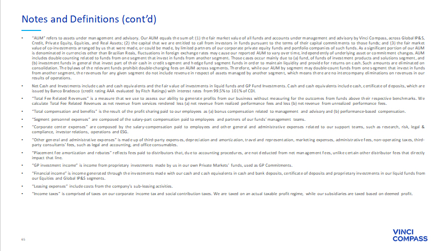 65 • “AUM” refers to assets under management and advisory . Our AUM equals the sum of : ( 1 ) the fair market value of all funds and accounts under management and advisory by Vinci Compass, across Global IP&S, Credit, Private Equity, Equities, and Real Assets ; ( 2 ) the capital that we are entitled to call from investors in funds pursuant to the terms of their capital commitments to those funds ; and ( 3 ) the fair market value of co - investments arranged by us that were made, or could be made, by limited partners of our corporate private equity funds and portfolio companies of such funds . As a significant portion of our AUM is denominated in currencies other than Brazilian Reais, fluctuations in foreign exchange rates may cause our reported AUM to vary over time, independently of underlying asset or commitment changes . AUM includes double counting related to funds from one segment that invest in funds from another segment . Those cases occur mainly due to (a) fund, of funds of investment products and solutions segment, and (b) investment funds in general that invest part of their cash in credit segment and hedge fund segment funds in order to maintain liquidity and provide for returns on cash . Such amounts are eliminated on consolidation . The bylaws of the relevant funds prohibit double - charging fees on AUM across segments . Therefore, while our AUM by segment may double - count funds from one segment that invest in funds from another segment, the revenues for any given segment do not include revenue in respect of assets managed by another segment, which means there are no intercompany eliminations on revenues in our results of operations . • Net Cash and Investments include cash and cash equivalents and the fair value of investments in liquid funds and GP Fund Investments . Cash and cash equivalents include cash, certificate of deposits, which are issued by Banco Bradesco (credit rating AAA evaluated by Fitch Ratings) with interest rates from 99 . 5 % to 101 % of CDI . • “Total Fee Related Revenues” is a measure that we use to assess our ability to generate profits from our business without measuring for the outcomes from funds above their respective benchmarks . We calculate Total Fee Related Revenues as net revenue from services rendered less (a) net revenue from realized performance fees and less (b) net revenue from unrealized performance fees . • “Total compensation and benefits” is the result of the profit sharing paid to our employees as (a) bonus compensation related to management and advisory and (b) performance - based compensation . • “Segment personnel expenses” are composed of the salary - part compensation paid to employees and partners of our funds’ management teams . • “Corporate center expenses” are composed by the salary - compensation paid to employees and other general and administrative expenses related to our support teams, such as research, risk, legal & compliance, investor relations, operations and ESG . • “Other general and administrative expenses” is made up of third - party expenses, depreciation and amortization, travel and representation, marketing expenses, administrative fees, non - operating taxes, third - party consultants’ fees, such as legal and accounting, and office consumables . • “Placement fee amortization and rebates” reflects fees paid to distributors that, due to accounting procedures, are not deducted from net management fees, unlike certain other distributor fees that directly impact that line . • “GP investment income” is income from proprietary investments made by us in our own Private Markets’ funds, used as GP Commitments . • “Financial income” is income generated through the investments made with our cash and cash equivalents in cash and bank deposits, certificate of deposits and proprietary investments in our liquid funds from our Equities and Global IP&S segments . • “Leasing expenses” include costs from the company’s sub - leasing activities . • “Income taxes” is comprised of taxes on our corporate income tax and social contribution taxes . We are taxed on an actual taxable profit regime, while our subsidiaries are taxed based on deemed profit . Notes and Definitions (cont’d)