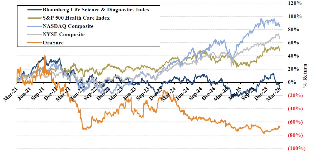 4 The 5-year and 10-year performance is calculated for the period 03/08/21 – 03/06/26 and 03/07/16 – 03/06/26, respectively. Data for the Bloomberg US 3000 Life Science & Diagnostics Price Return Index, S&P Health Care Index, NASDAQ Composite Index and the NYSE Composite Index assume reinvestment of dividends. OraSure vs. Relevant Index performance figures may not equal the calculated differences due to rounding.