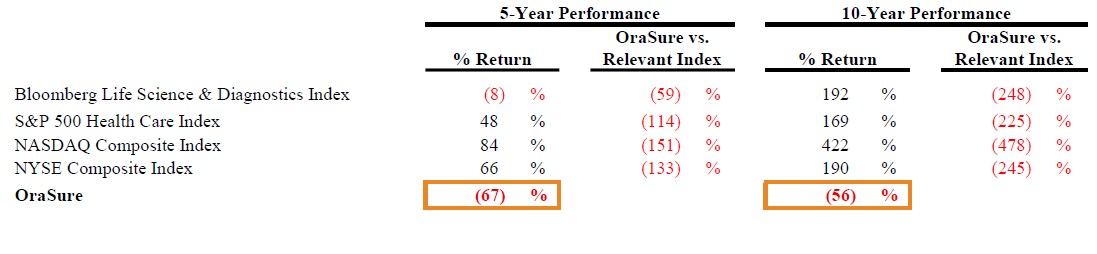 | 1. | Chronic Underperformance. OraSure’s share price has dramatically underperformed comparable companies and broader indices over both five- and ten-year periods. Recent underperformance has been driven by repeated operational and strategic failures under the current management team—failures that occurred on the Board’s watch. Despite this track record, the Company continues to burn cash pursuing speculative diagnostics investments to the detriment of shareholders. |