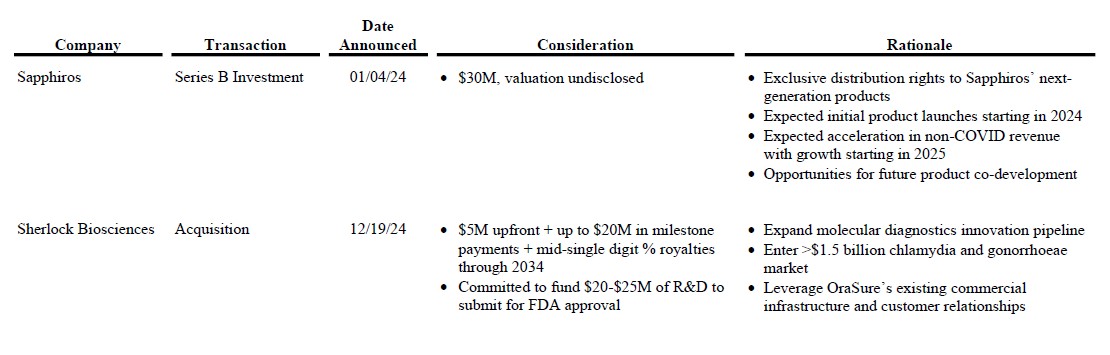 In January 2024, OraSure invested $30 million in Sapphiros, a startup diagnostic platform company with no commercial products on the market. The Company told investors that “distribution of Sapphiros’ products is expected to accelerate revenue growth in OraSure’s core business beginning in 2025.”5 That growth never came. By year-end 2025, OraSure’s core business (“non-COVID revenue”) had declined 27%, and the Company has not provided a recent update on the status of its Sapphiros investment or the revenue it was expected to generate.